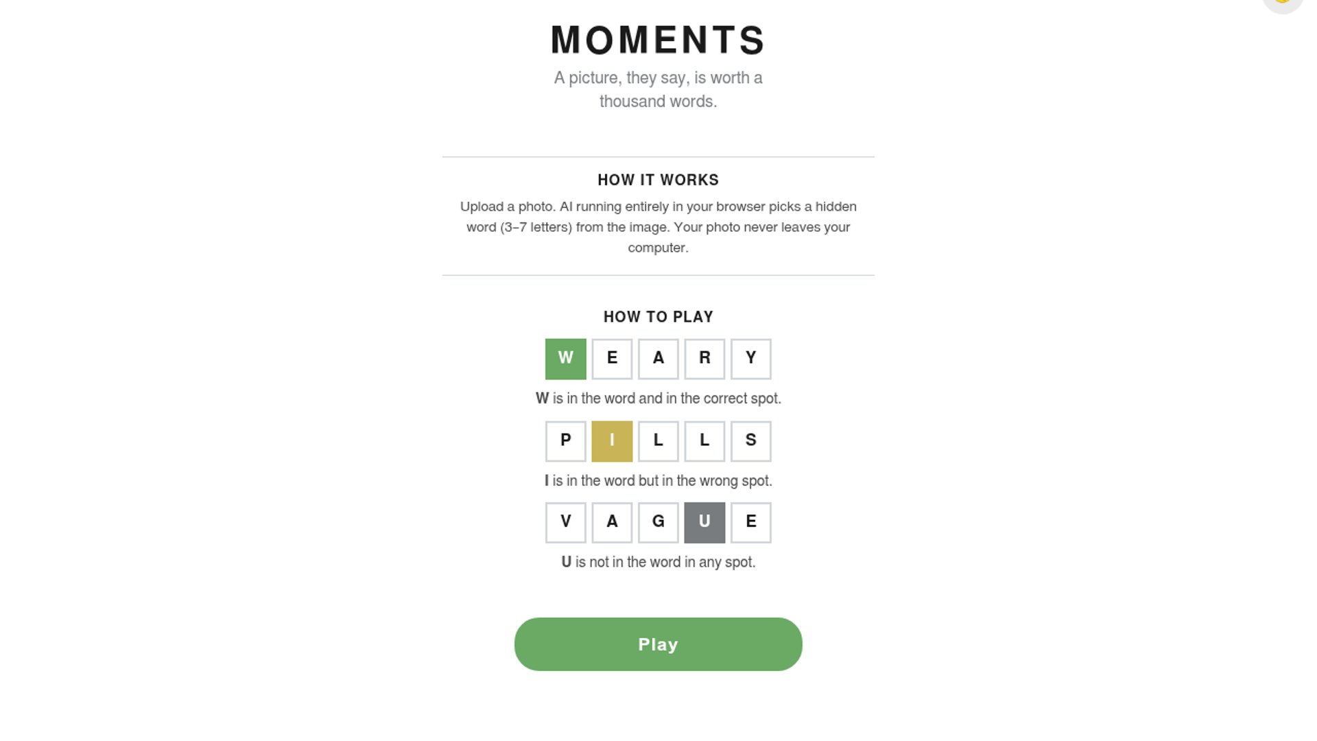 Moments is a browser-only Wordle-style game where you upload a photo, a local vision model captions it, and it picks a hidden word from the image. The app keeps everything on-device and currently targets desktop browsers because phone-browser vision models are still too immature.