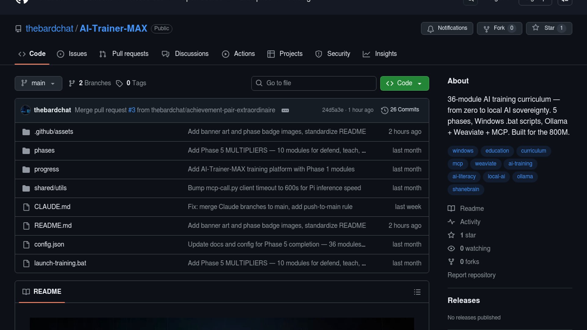 AI-Trainer-MAX is a Windows-first open-source GitHub curriculum for building a local AI stack, from Ollama basics and RAG to business automation, personal vaults, and a family-passing "YourNameBrain." The repo brands the effort as Angel Cloud AI Training Tools (ACATT) and ships 36 modules across 5 phases with a 7.4GB RAM ceiling.