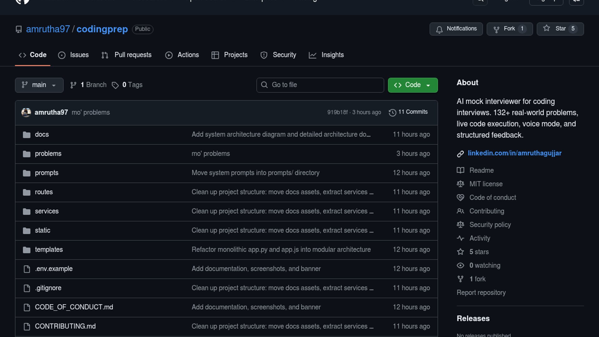 CodePrep is an open-source Python app that simulates coding interviews with an AI interviewer, built-in code execution, voice mode, and structured feedback. It ships 132+ real-world problems and keeps sessions, history, and code local, with OpenAI handling only the messages and code you send.