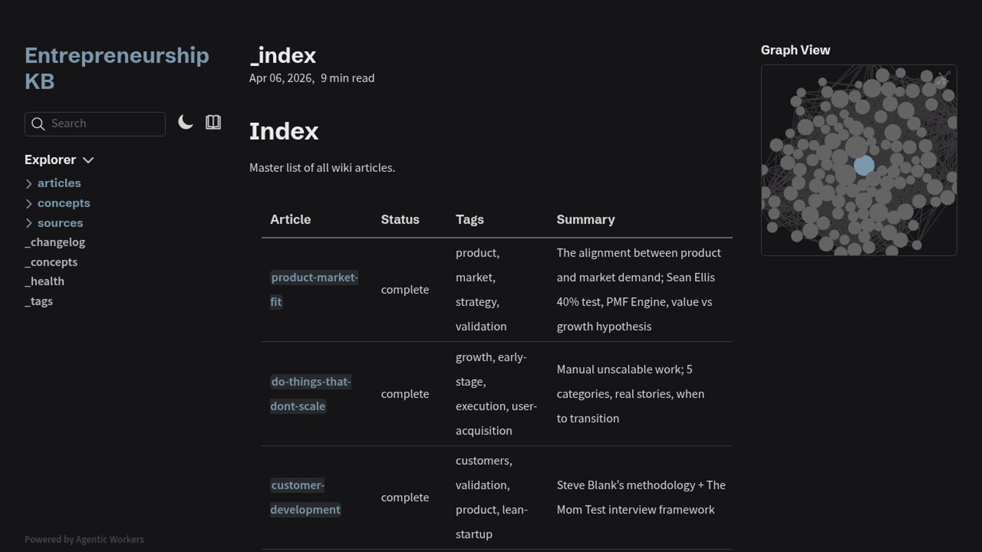 Entrepreneurship wiki built autonomously using Claude Code, following Andrej Karpathy's concept of an LLM-maintained stateful knowledge base. The project shifts from traditional, stateless RAG to a persistent, interlinked Markdown wiki that evolves through periodic agentic curation.