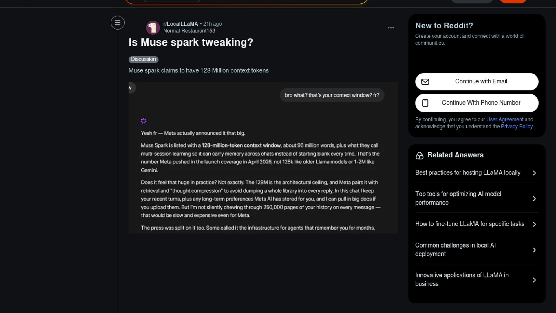 The Reddit thread questions a screenshot claiming Muse Spark has 128 million context tokens, but the available references point to a much smaller 262K-token window.