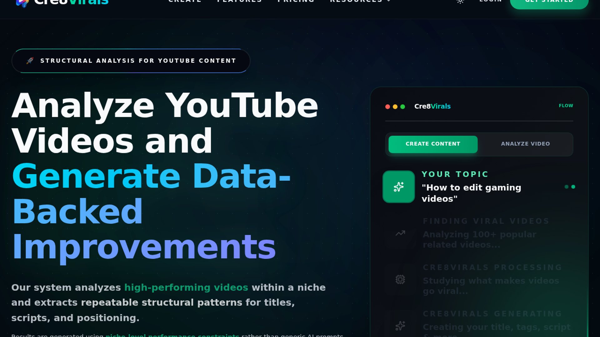 Cre8Virals is an AI-powered YouTube growth tool that analyzes high-performing videos in a niche and turns those patterns into ready-to-publish content assets. Its core promise is to help creators generate better titles, descriptions, tags, scripts, thumbnail ideas, and upload timing recommendations by studying what already performs well. The product positions itself as a practical growth system for creators who want to scale faster using niche-specific analysis and repeatable formats.