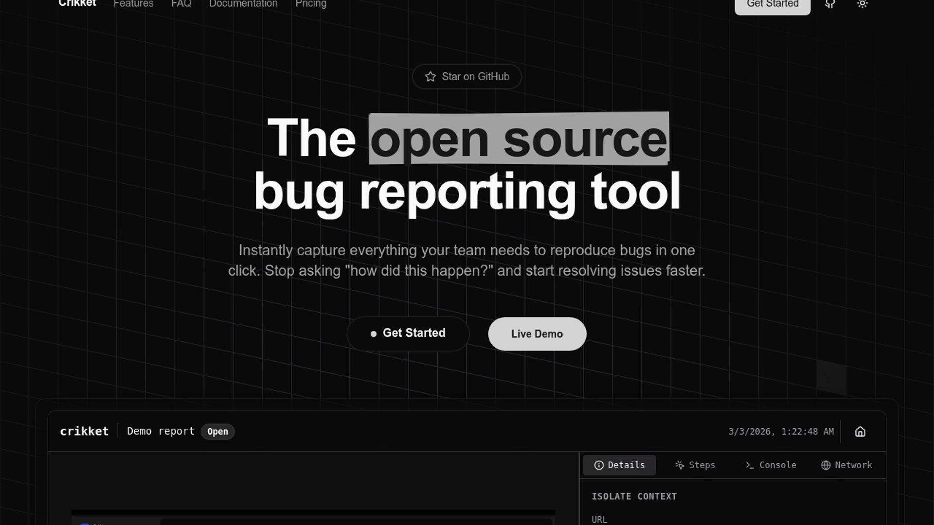 Crikket is a new open-source bug reporting tool that lets teams capture screenshots or screen recordings, then bundles reproduction steps, console logs, and network requests into a shareable report. Positioned as an alternative to Jam.dev and Marker.io, it offers both a hosted app and a self-hosted deployment path for teams that want more control.
