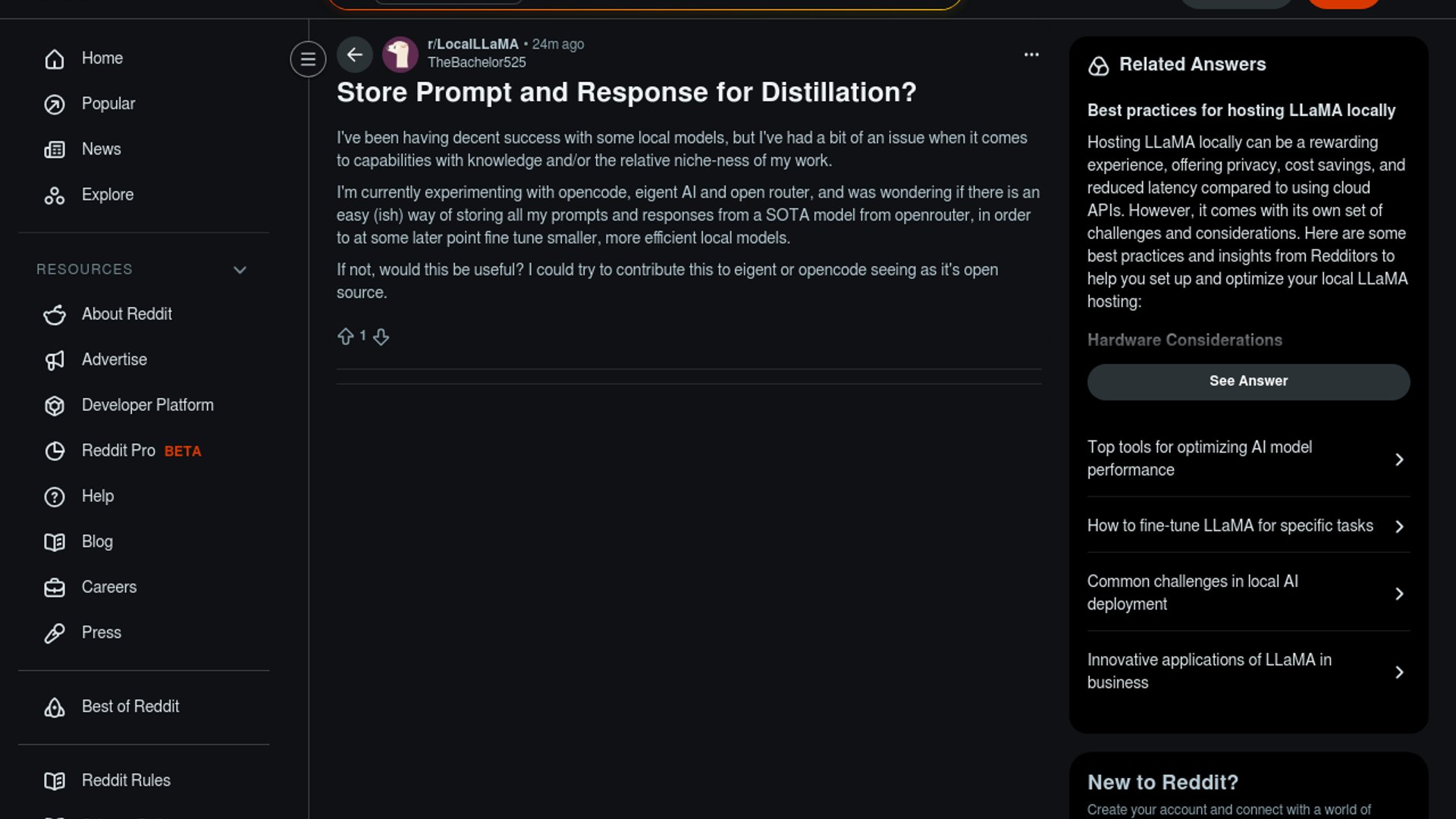 A LocalLLaMA user asks whether OpenCode, Eigent, or OpenRouter already support capturing prompt/response pairs for later distillation into smaller local models. The thread treats transcript capture as infrastructure for niche fine-tuning and asks whether the feature would be worth contributing back to the open-source tools.
