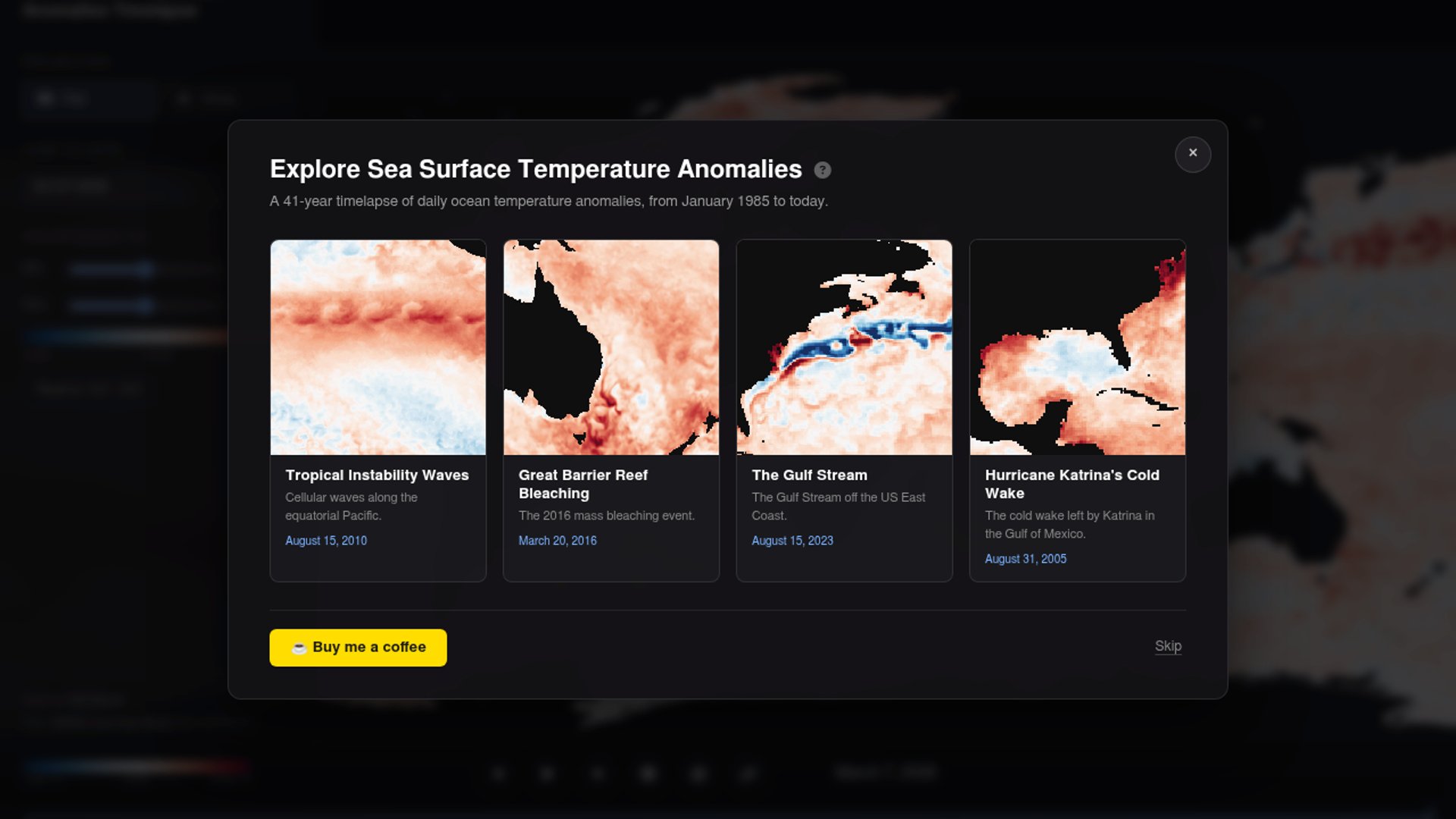 Sea Surface Temperature Anomalies Timelapse is an interactive visualization that animates daily ocean temperature anomalies from January 1985 to the present. Built by Will Meyers on top of NOAA Coral Reef Watch 5km SSTA v3.1 data, it lets people scrub through time, pause and play the animation, change projection and color scale, and jump to notable events like Great Barrier Reef bleaching, the Gulf Stream, and Katrina’s cold wake. It reads more like a polished science explainer than a conventional startup product, but the interaction design makes a large climate dataset immediately legible.