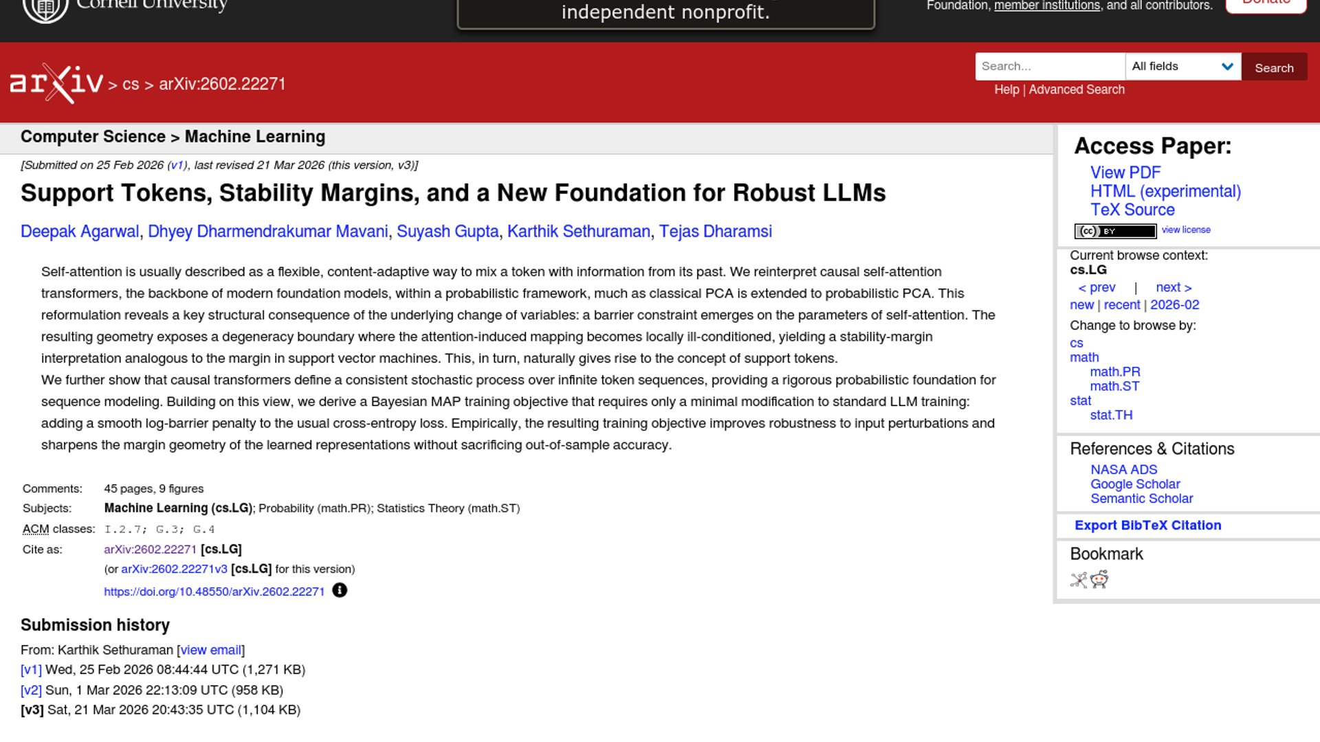 Researchers propose a probabilistic foundation for causal self-attention, introducing "support tokens" and a log-barrier penalty to improve model stability and robustness. By treating token embeddings as latent variables, the framework reveals a "degeneracy boundary" that allows for explicit optimization of attention stability.