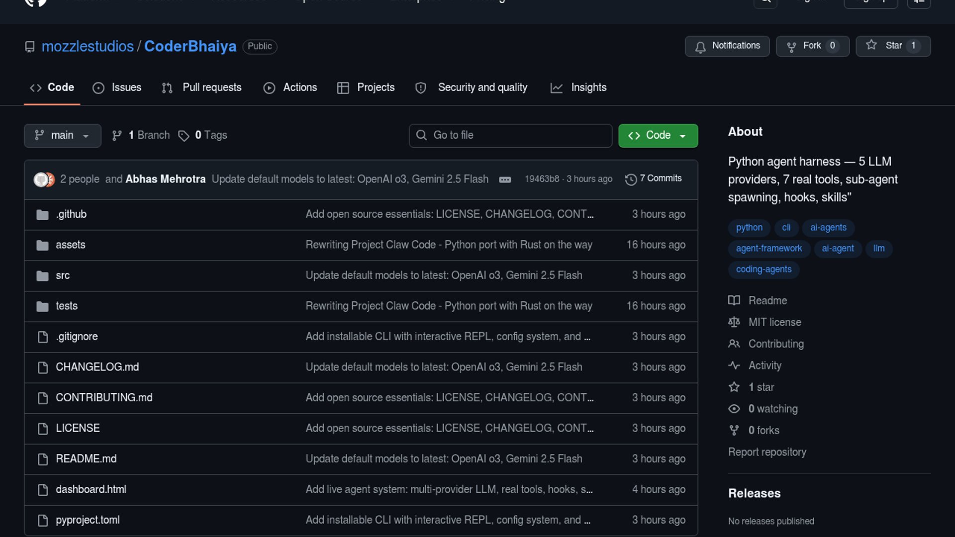 CoderBhaiya is a Python-based agent harness built to talk to five LLM providers through one interface, including local setups like Ollama and LM Studio without external SDK dependencies. It includes a full turn loop, seven core tools for file and shell work, hooks, and sub-agent spawning, making it feel like a local coding agent you can run from the CLI.