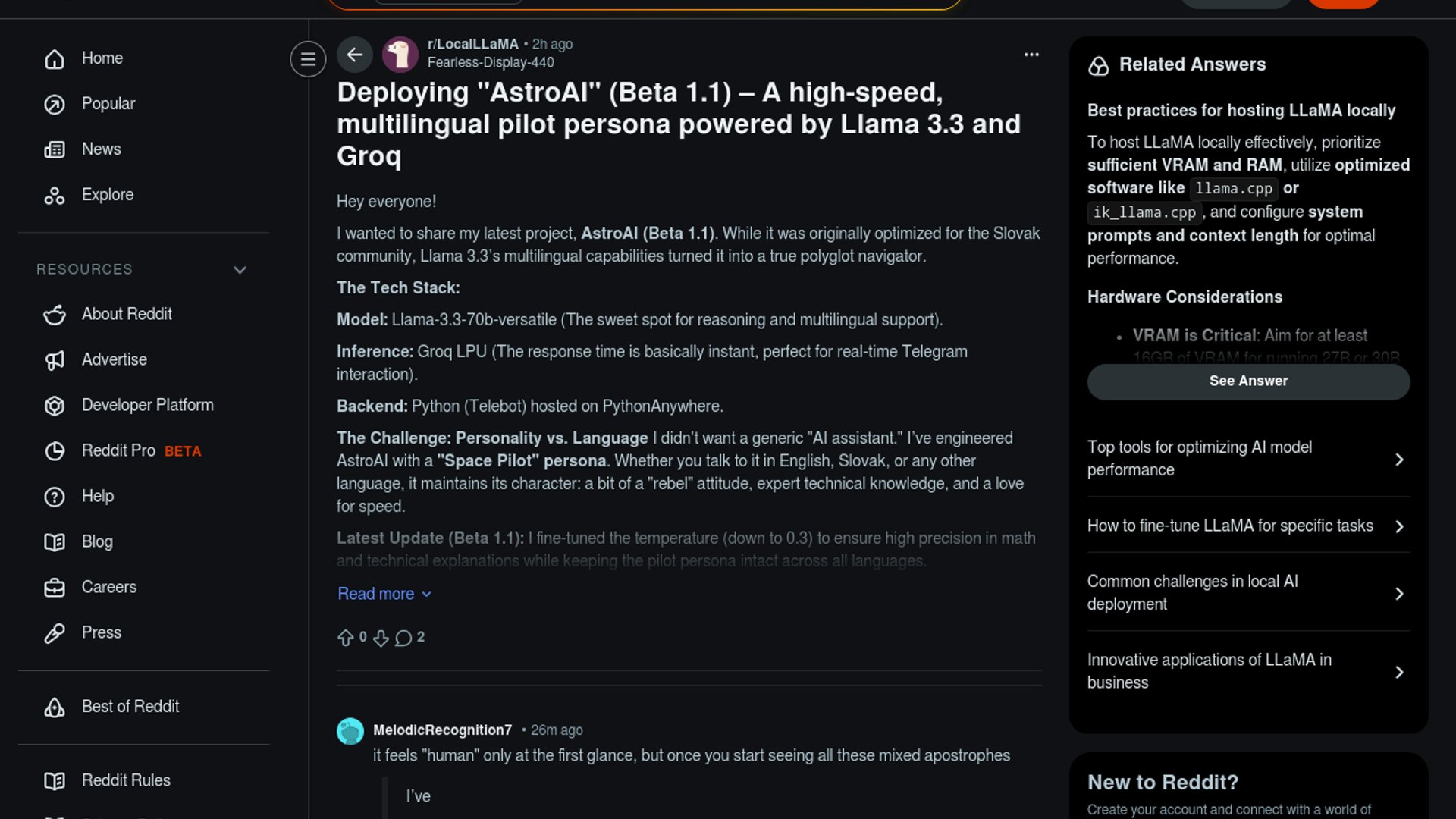 AstroAI Beta 1.1 is a Telegram-based pilot persona bot that now leans on Llama 3.3 70B via Groq for fast multilingual replies. The update tightens temperature to improve math and technical accuracy while keeping the character consistent across languages.