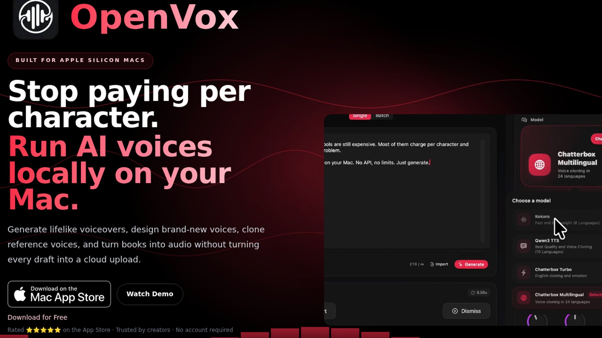 OpenVox is a Mac-only, Apple Silicon-native local voice AI app that runs text-to-speech, voice cloning, voice conversion, audiobook generation, and voice design fully on-device. The maker is positioning it as a friction-free alternative to the usual local TTS stack: no Python environment, no API key, no cloud processing, and no data leaving the machine. It ships with support for Kokoro, Qwen3 TTS, and Chatterbox, plus 300+ voices across 23 languages, all delivered through a SwiftUI app powered by MLX and available on the Mac App Store.