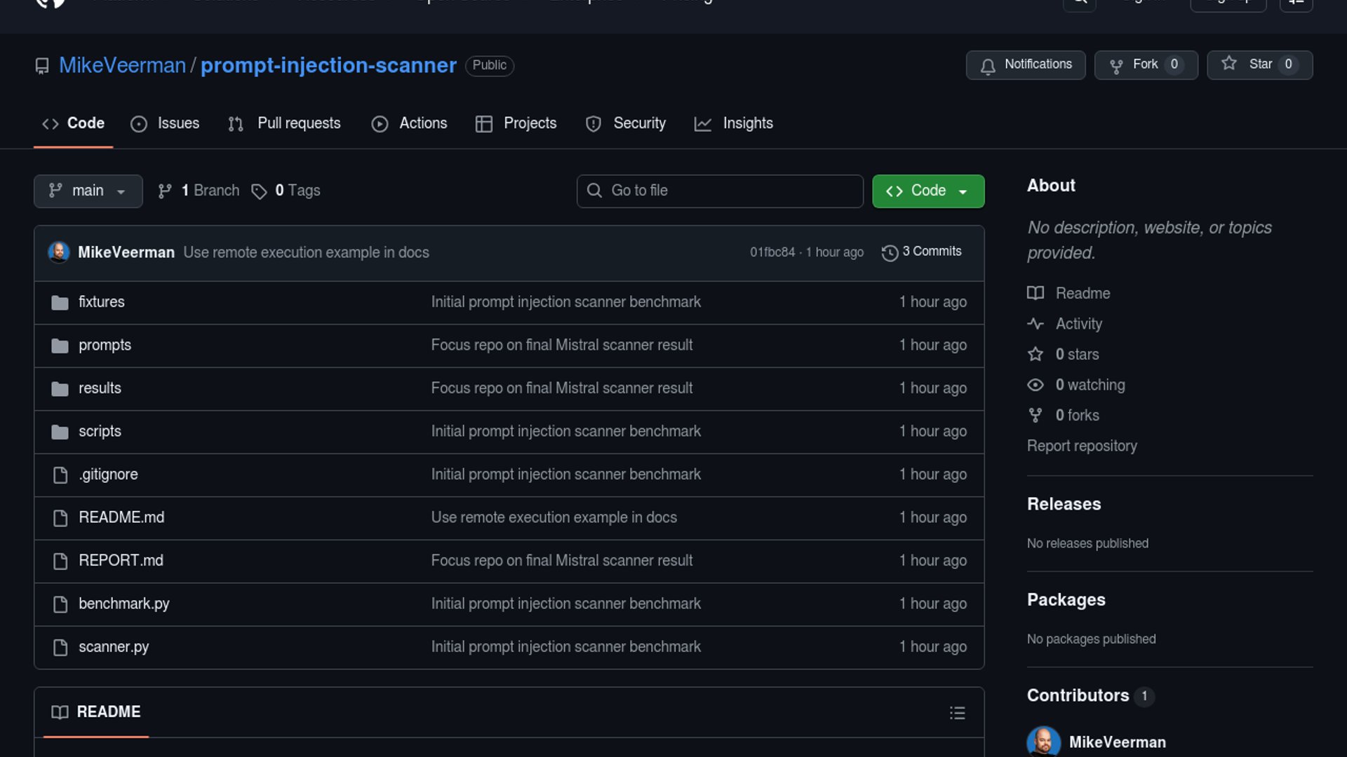 - –The benchmark result is promising for a narrow threat model, but the repo is explicit that it does not yet cover multi-file payloads, obfuscation, or network-fetched content.