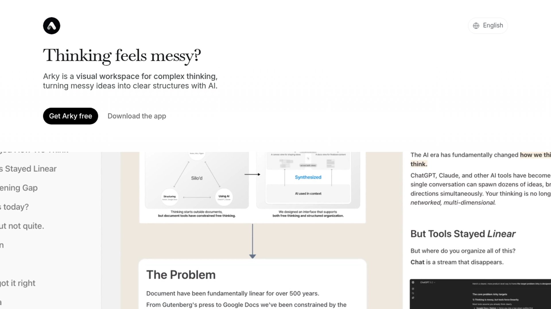 The interesting part here is not “AI writing” but the attempt to make thinking itself spatial, while still preserving enough structure to finish real work. That makes Arky feel closer to a research or planning surface than a conventional note app.