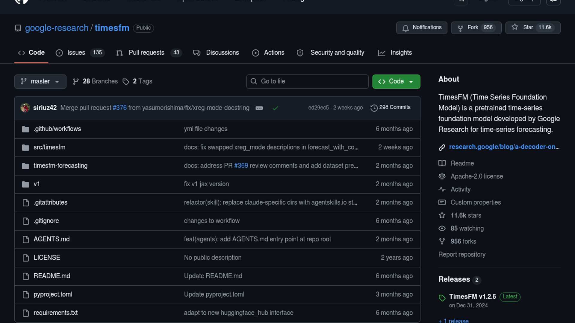 TimesFM is Google Research’s pretrained time-series foundation model for forecasting, packaged as an open-source Python library with checkpoints and inference APIs. The repo highlights the latest TimesFM 2.5 release, which reduces the model to 200M parameters, expands context length to 16k, and adds continuous quantile forecasting support, making it a more practical general-purpose forecasting stack for developers who want strong zero-shot baselines without training a model from scratch.