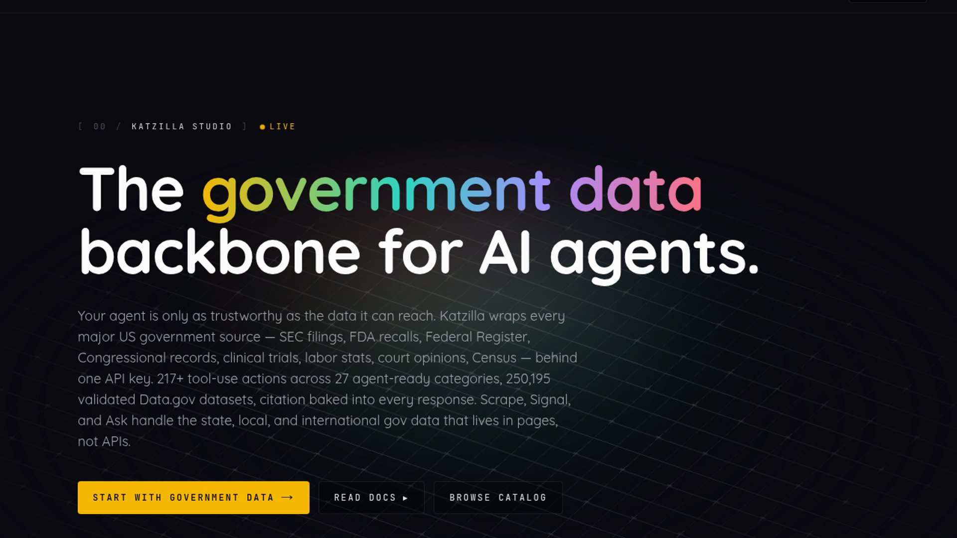 Katzilla launches a unified API for government data, packaging 250,195 validated Data.gov datasets, 217+ tool-use actions, and source citations for AI agent workflows. It targets agents that need primary-source answers from SEC filings, FDA recalls, Federal Register notices, Census data, court opinions, and other public records.