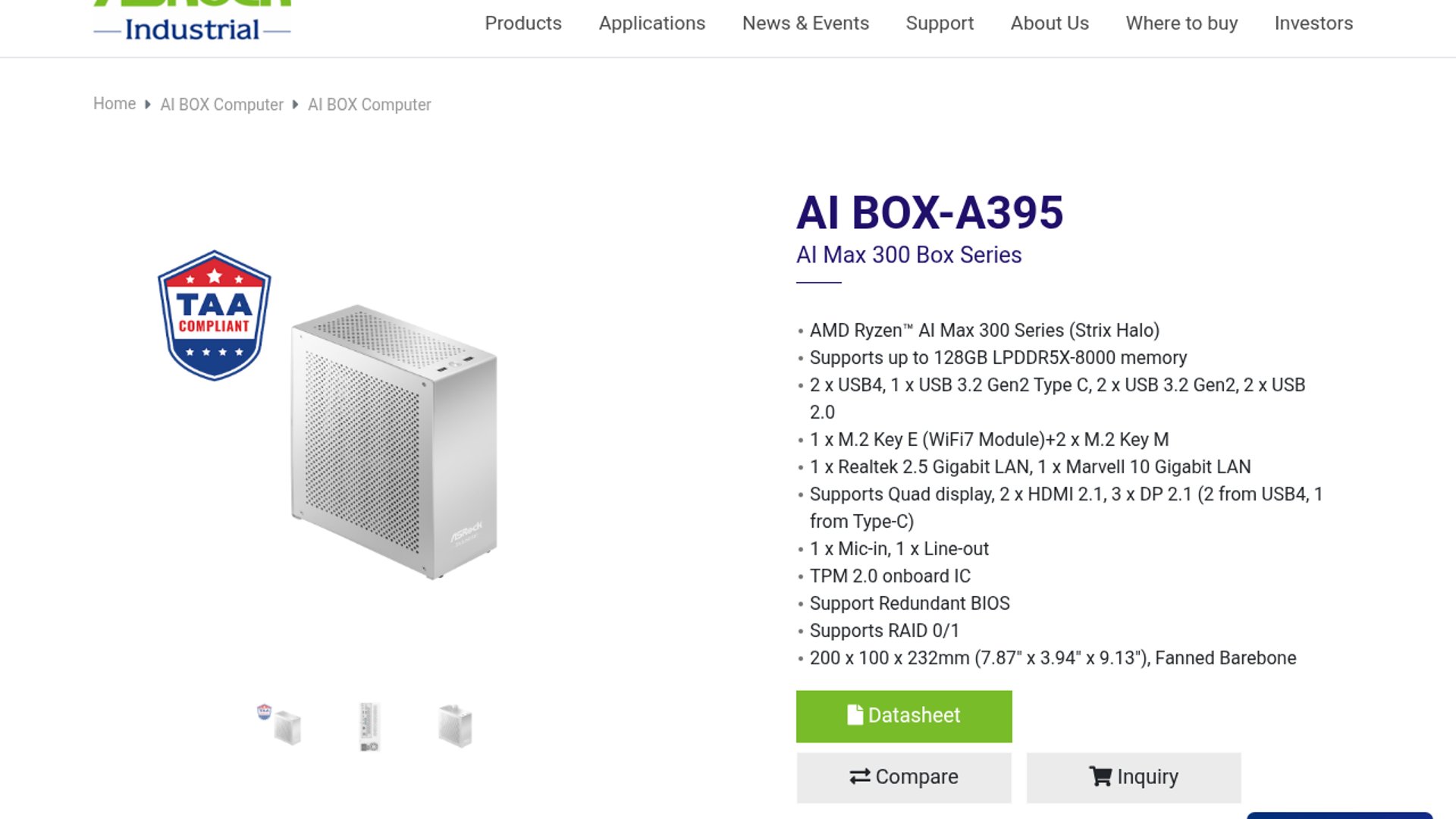 ASRock Industrial introduced the AI BOX-A395, a compact Ryzen AI Max+ 395 system that combines up to 16 Zen 5 cores, Radeon 8060S graphics, and a 50 TOPS XDNA 2 NPU with up to 128GB LPDDR5x unified memory. The box targets on-device LLM inference, content creation, and engineering workloads, but pricing and ship timing have not been disclosed.