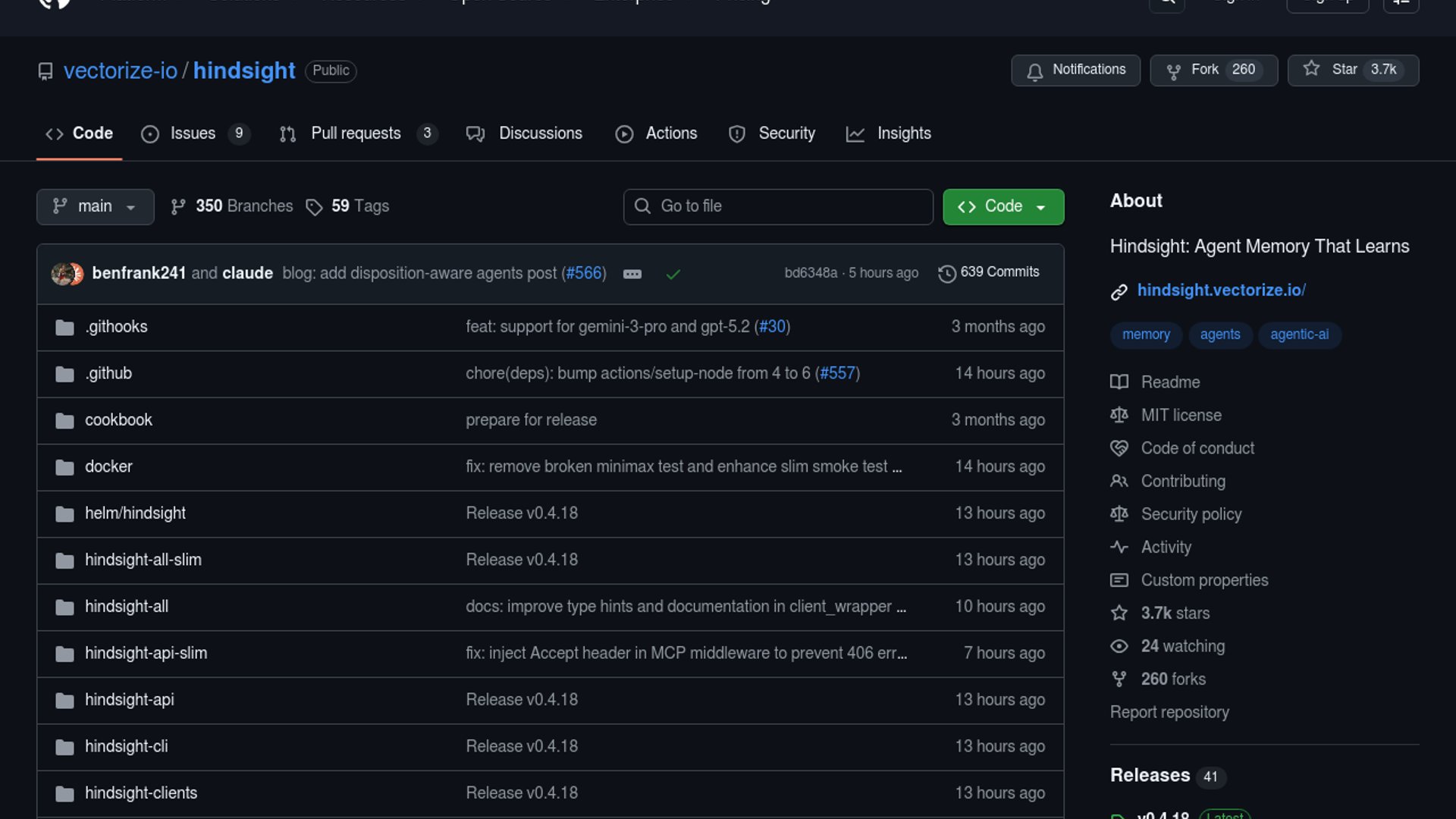 Hindsight, an MIT-licensed open-source memory system from Vectorize, is climbing GitHub Trending quickly (3,707 stars, +595 today) by focusing on agent learning rather than chat-history recall. The project ships retain/recall/reflect workflows, multi-provider model support, and benchmark-driven positioning around long-term agent memory quality.