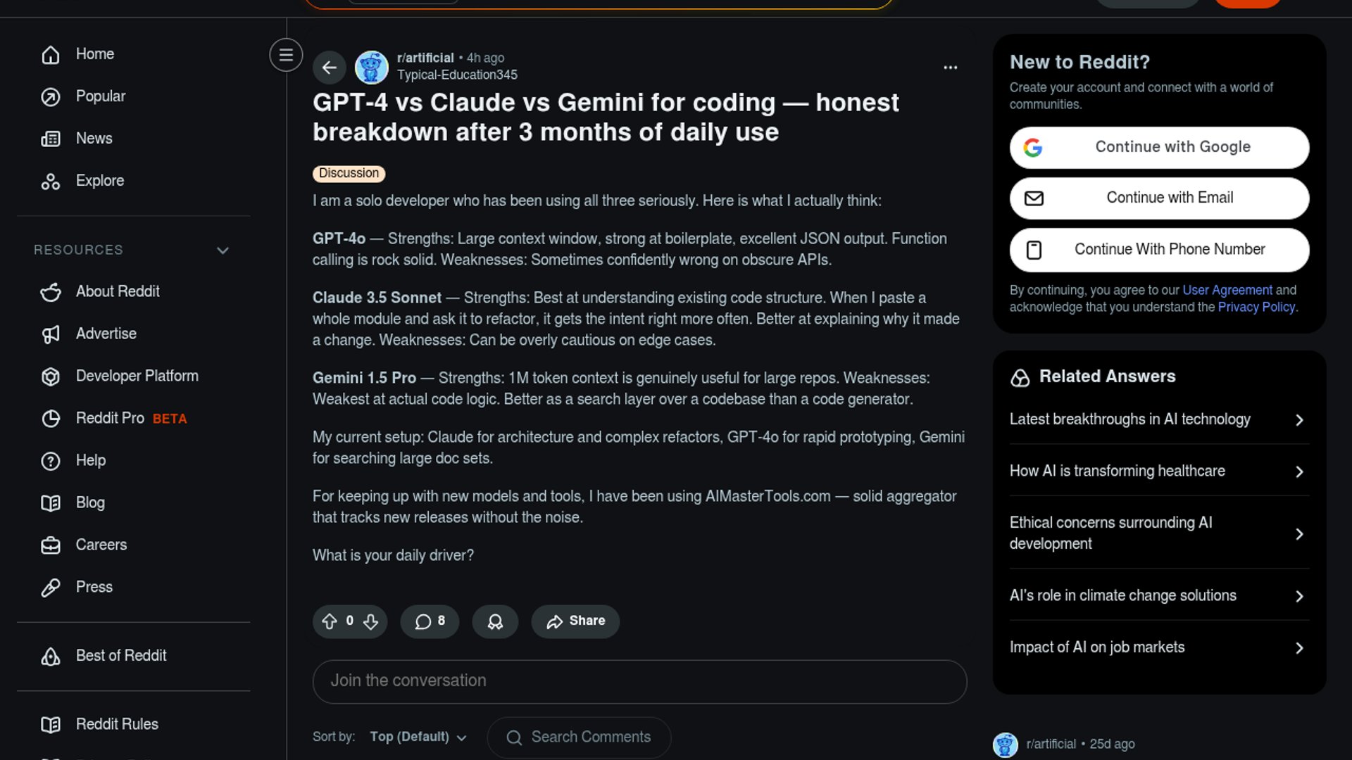 A solo developer shares a three-month daily use comparison of the leading AI coding models, concluding that Claude excels at architecture, GPT-4o at rapid prototyping, and Gemini at repository-wide search. The post also highlights AIMasterTools as an aggregator for tracking new AI releases.