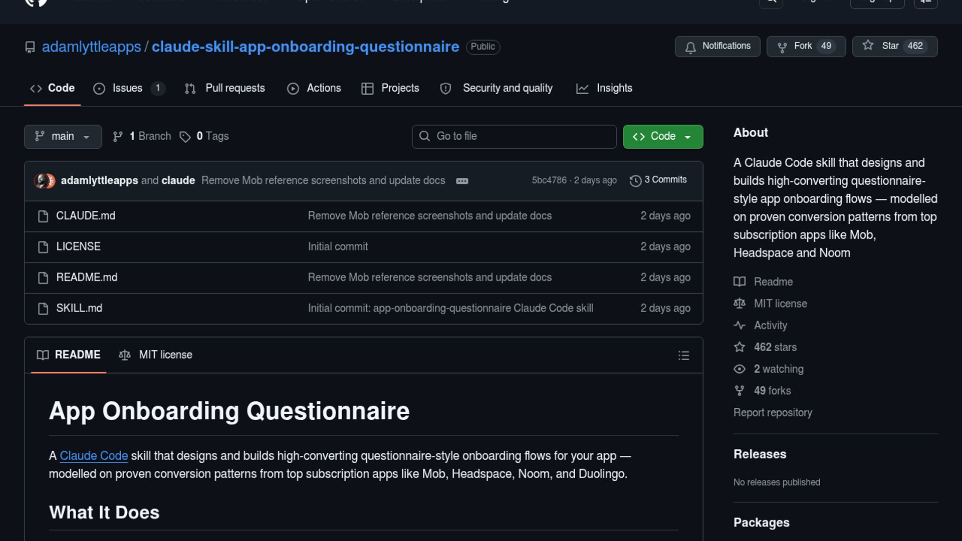 This open-source Claude Code skill generates and builds questionnaire-style app onboarding flows modeled on high-converting subscription app patterns like Mob, Headspace, Noom, and Duolingo. It goes beyond copy generation by analyzing the codebase, defining the user transformation, drafting screen-by-screen onboarding logic, and producing native implementation guidance for frameworks like SwiftUI, React Native, and Flutter.