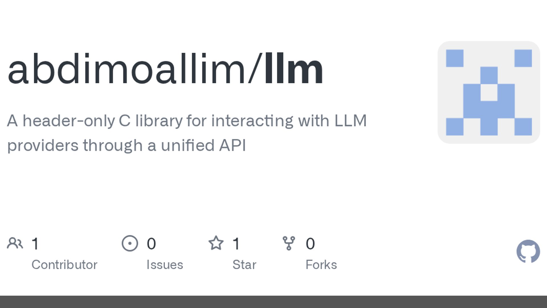 `llm` is an Apache-2.0, header-only C library for calling LLM providers through a single interface, plus a companion CLI. The project targets C99 and uses libcurl and pthreads, with support for providers like OpenAI, Anthropic, Groq, Ollama, Together AI, Mistral, Cohere, Gemini, DeepSeek, OpenRouter, Perplexity, Fireworks, vLLM, and custom endpoints. The README shows support for sync, streaming, async, batch, and tool-calling workflows, along with configurable retries, timeouts, proxy settings, and stats reporting.
