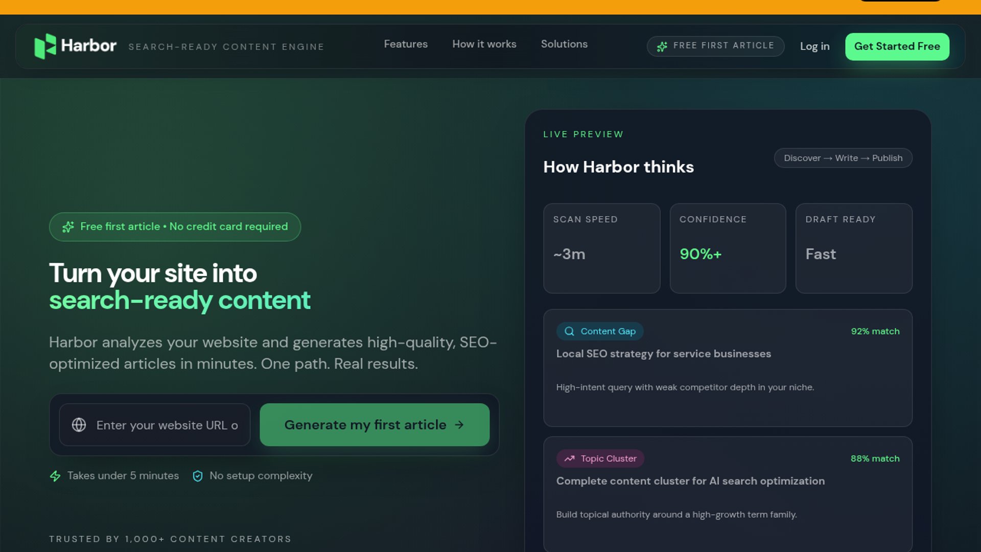 - –Harbor’s homepage confirms the core product: site scanning, topic discovery, AI article generation, internal linking, and bulk content workflows
