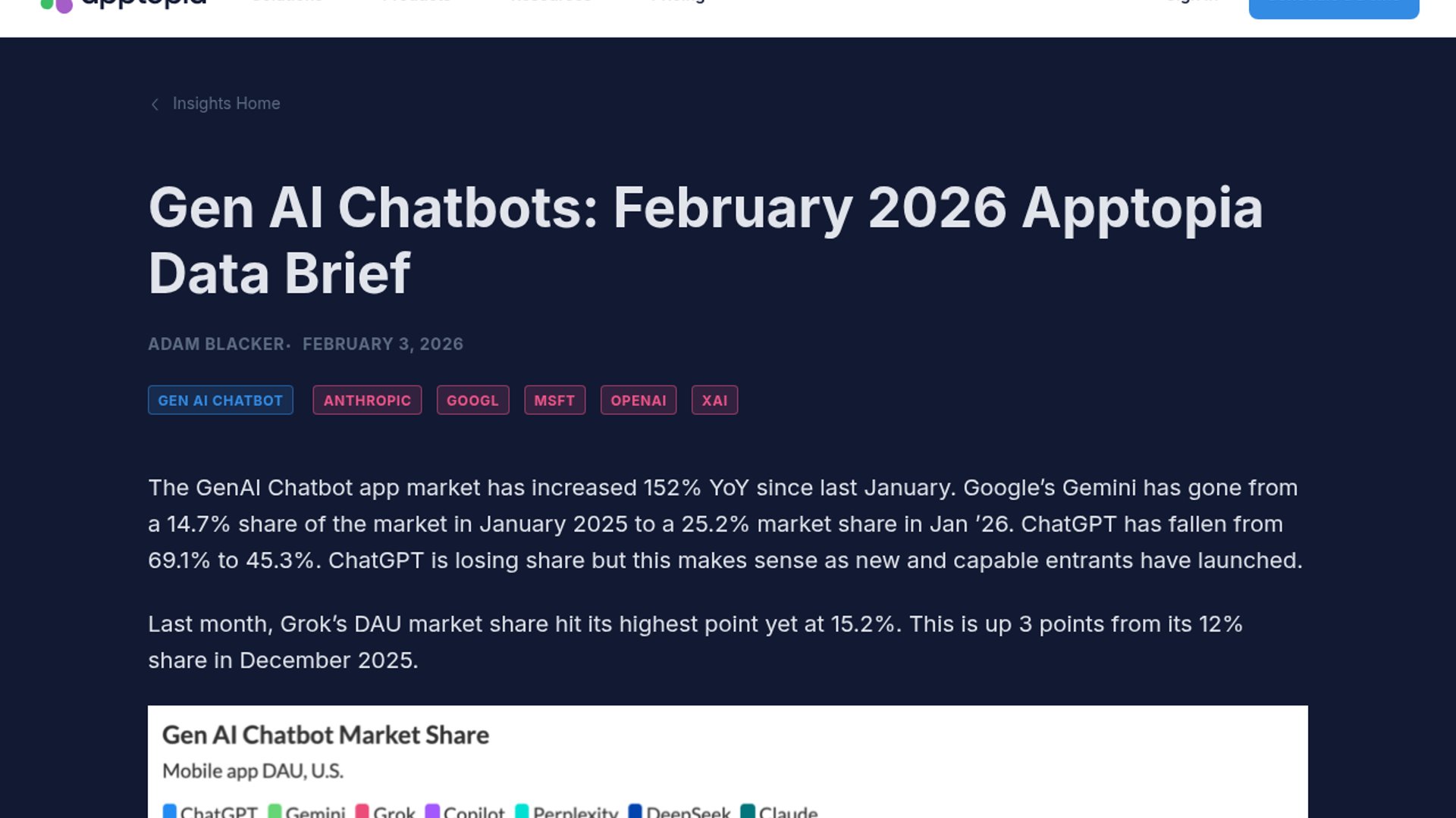 Apptopia's February 2026 data brief shows ChatGPT's share of the Gen AI chatbot market dropping from 69.1% to 45.3% year-over-year, while Google Gemini climbed to 25.2% and Grok hit a record 15.2% DAU share. Claude leads the category in average time spent per DAU at 34.7 minutes despite lower install volume.