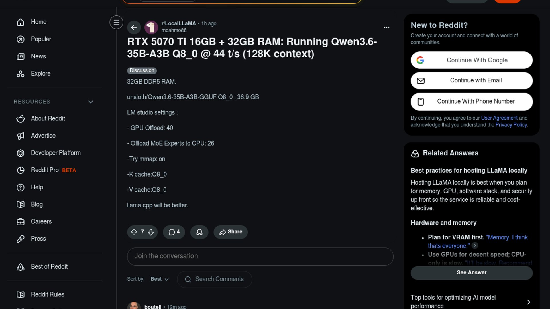 A LocalLLaMA user reports Qwen3.6-35B-A3B GGUF Q8_0 running at 44 tokens per second on an RTX 5070 Ti 16GB with 32GB DDR5 RAM. The setup uses a 36.9GB quant, LM Studio offload tuning, and 128K context, making this a practical local-inference datapoint rather than a formal benchmark.