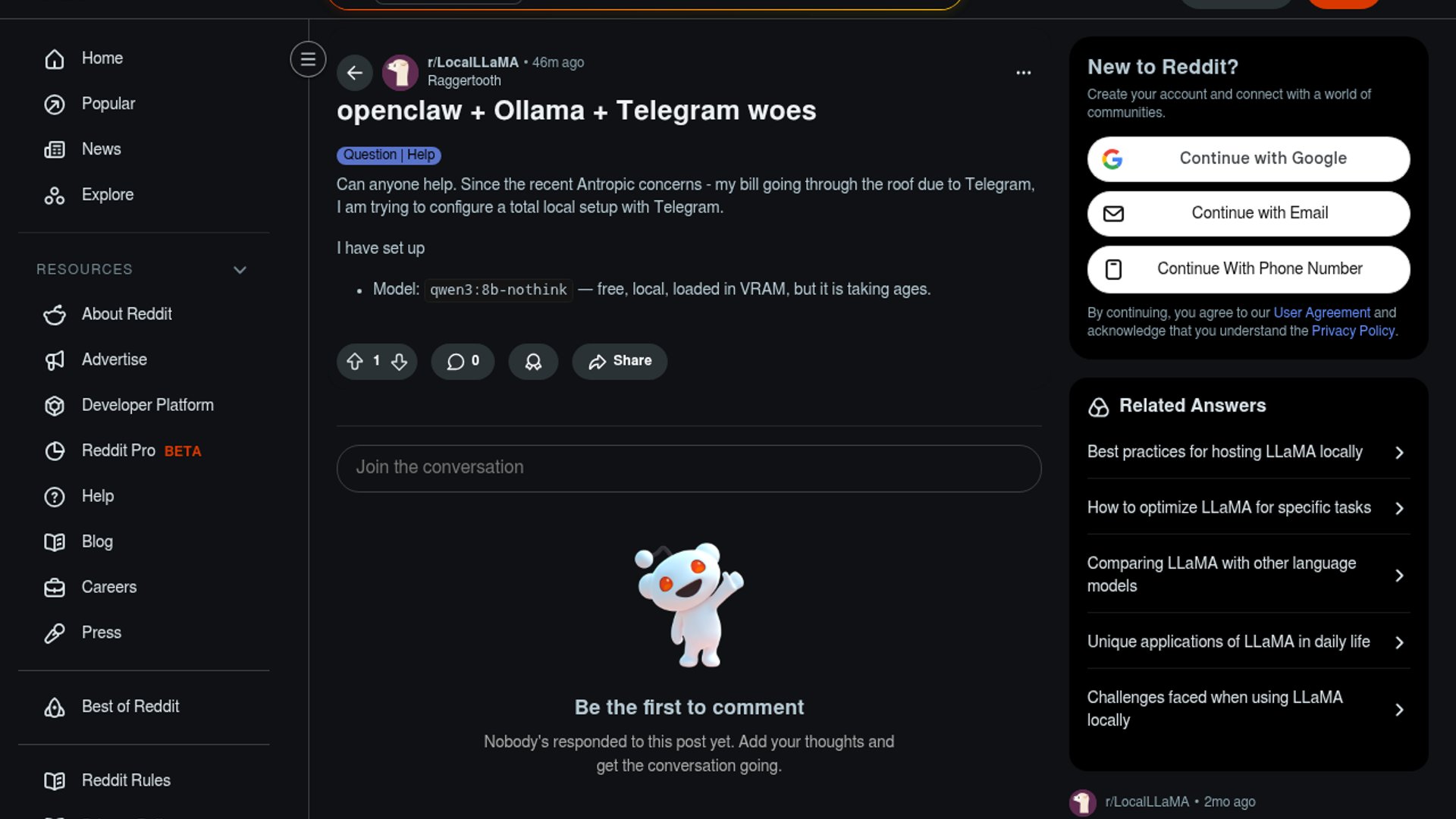 A Reddit user is trying to run OpenClaw fully local with Ollama and Telegram, but qwen3:8b-nothink is taking too long to answer even when the model itself works. The post is really about the brittle edge where local inference, Telegram delivery, and agent streaming all have to cooperate.