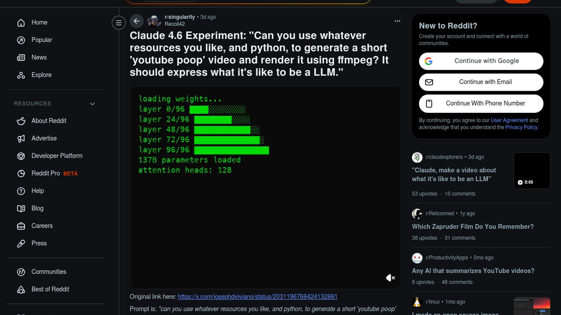 Claude Opus 4.6, prompted to express "what it's like to be an LLM" as a YouTube Poop-style video using Python and ffmpeg, produced a full MP4 with glitch effects, VHS tracking, chromatic aberration, scanlines, and procedural audio — all generated from scratch, no external assets required. The clip went viral across Reddit, HN, and X.