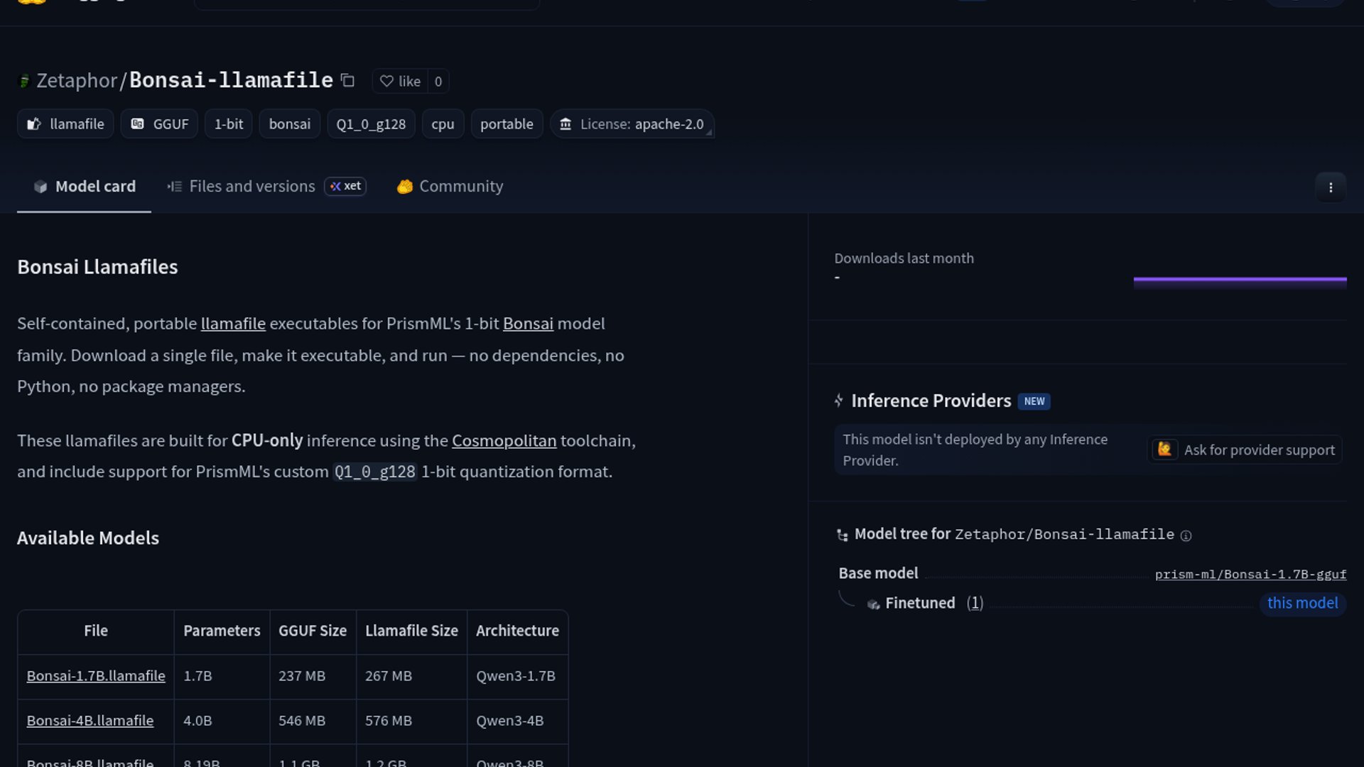 Zetaphor packaged PrismML's Bonsai 1-bit GGUF models as self-contained llamafile executables for CPU-only inference. The repo ships 1.7B, 4B, and 8B builds that run on Linux, macOS, and Windows without Python or package managers.