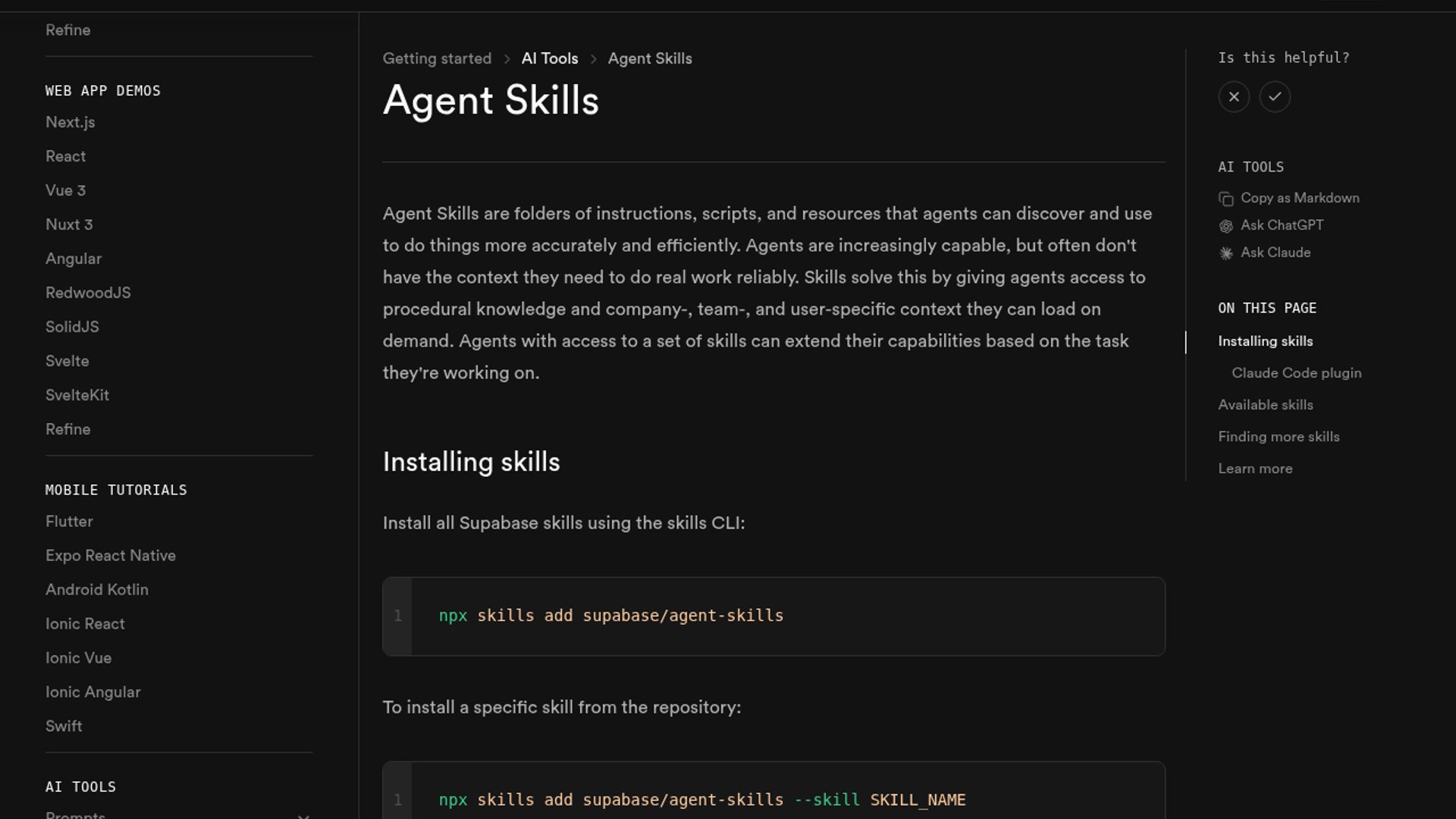 Supabase Agent Skills package reusable instructions, scripts, and references for AI coding agents working on Supabase, with install paths for the CLI and Claude Code plugin ecosystem. The repo and docs frame them as a way to make agents more reliable on Supabase-specific work like auth, migrations, Edge Functions, and Postgres tuning.