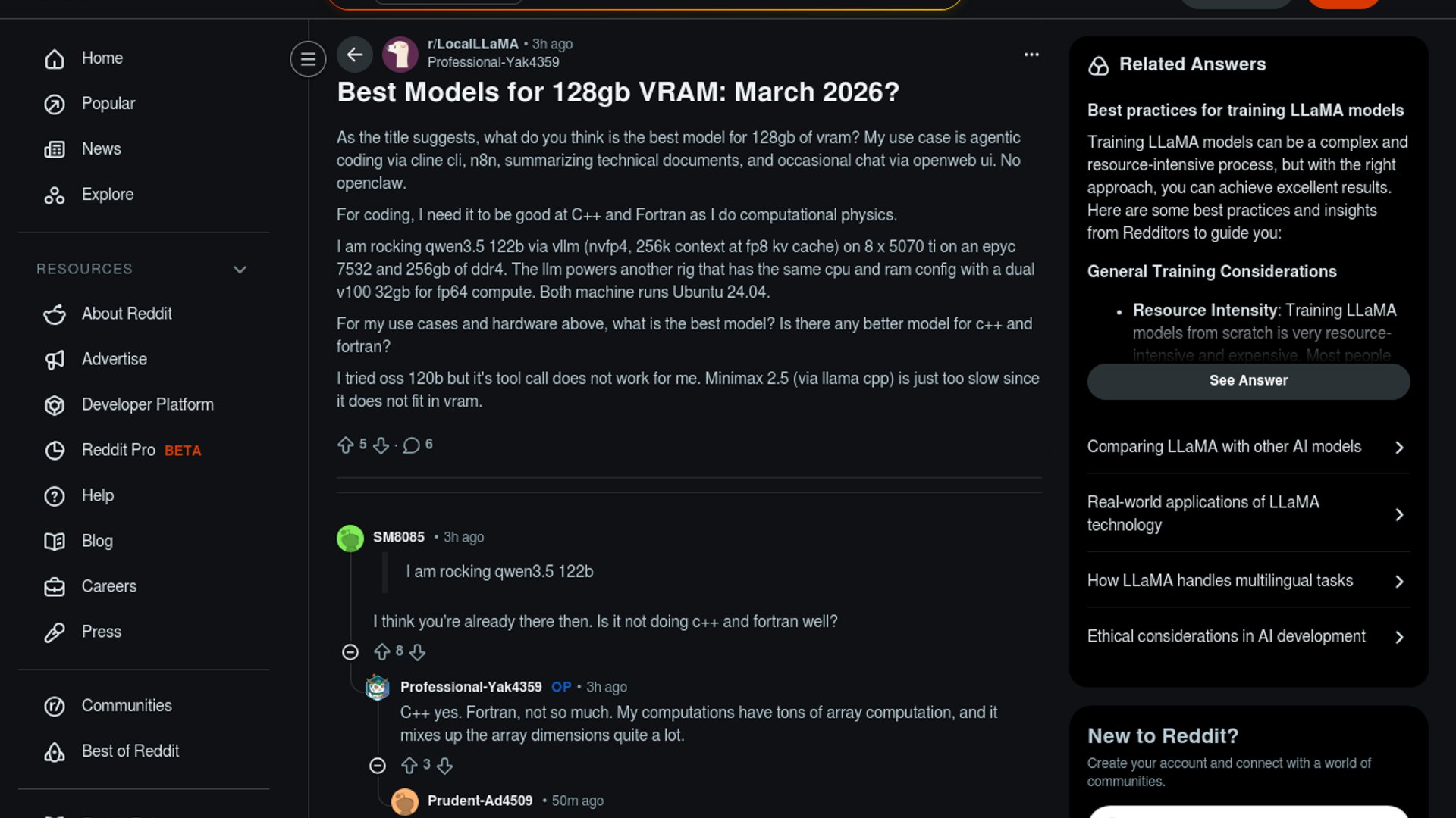 A LocalLLaMA thread asks whether anything beats Qwen3.5 122B on a 128GB VRAM rig for agentic coding, document summarization, and chat, especially for C++ and Fortran workloads. The discussion reflects a broader 2026 reality: strong open-weight models now fit serious home-lab hardware, but tool calling, latency, and harness quality still matter as much as raw benchmark claims.