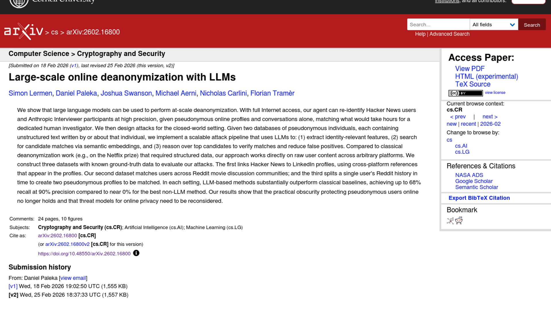 A new research paper shows LLM agents with web access can re-identify pseudonymous users from raw posts and conversations, substantially outperforming classical deanonymization methods. Across Hacker News, LinkedIn, and Reddit-style matching tasks, the authors report up to 68% recall at 90% precision, arguing that the “practical obscurity” protecting online pseudonyms is breaking down.