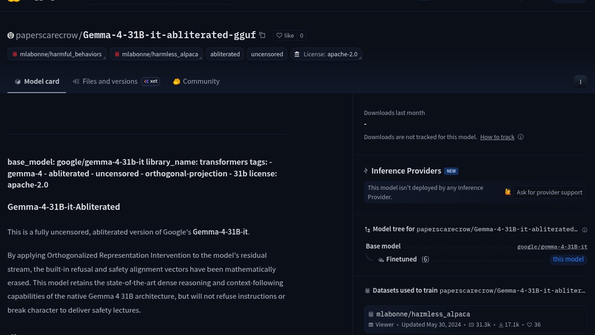 Researcher paperscarecrow has released abliterated GGUF quants for Google's flagship Gemma 4 31B model, mathematically removing the built-in refusal mechanisms. By using Orthogonalized Representation Intervention (ORI) targeted specifically at Layer 59, the release provides a fully compliant, uncensored version of the model that maintains its core reasoning capabilities while fitting on consumer-grade 24GB GPUs.
