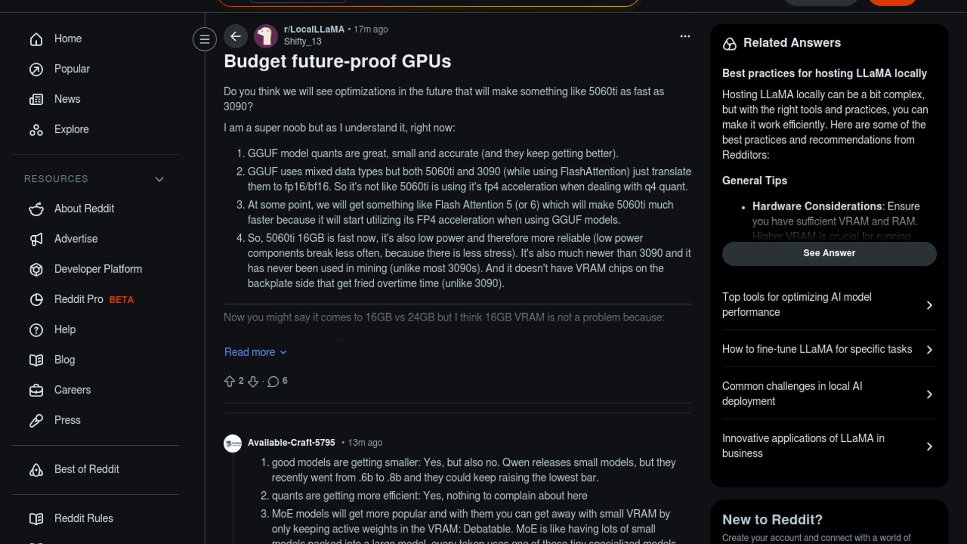 A Reddit user asks whether a 16GB GeForce RTX 5060 Ti could eventually run local LLMs as fast as a 24GB GeForce RTX 3090 if future runtimes and model formats get smarter. Blackwell does add FP4 support, but the 3090 still has a major edge in VRAM and memory bandwidth.