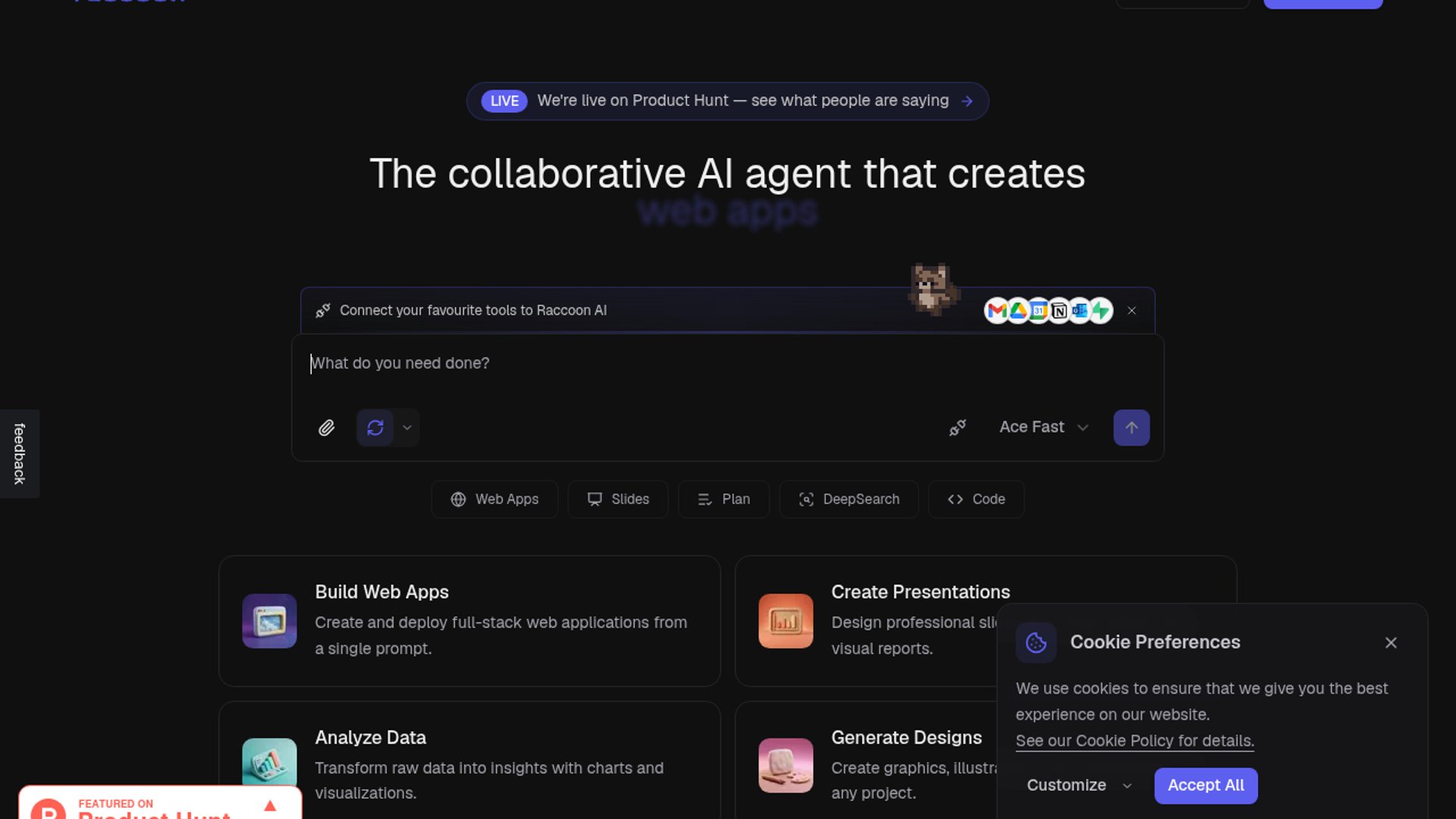 Raccoon AI launched on Product Hunt as a general-purpose collaborative agent that can browse the web, use a terminal, and produce deliverables like web apps, decks, reports, and media from one prompt. The product is positioning itself as a “Cursor for anything” workspace where users can steer execution instead of just chatting.