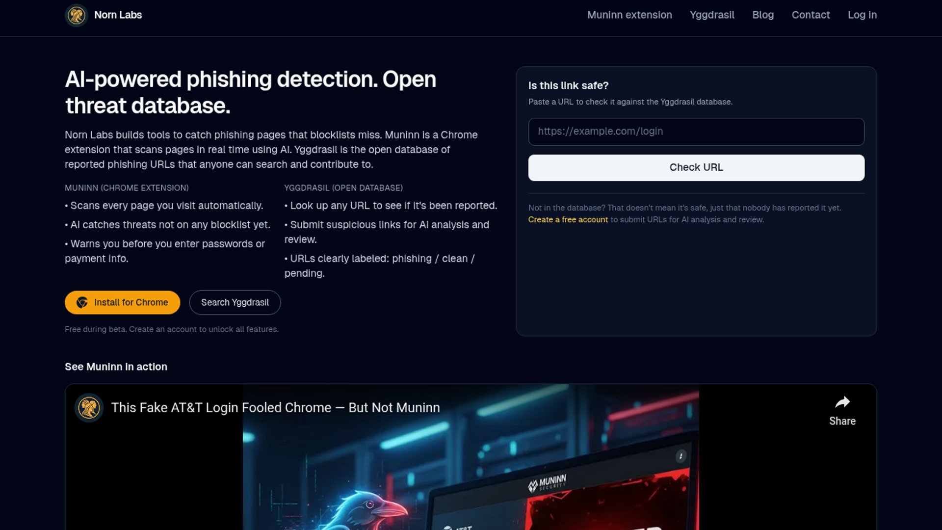 - –Norn positions Muninn as a two-layer model (automatic URL/heuristic scan plus deeper visual scan) rather than pure blocklist matching.