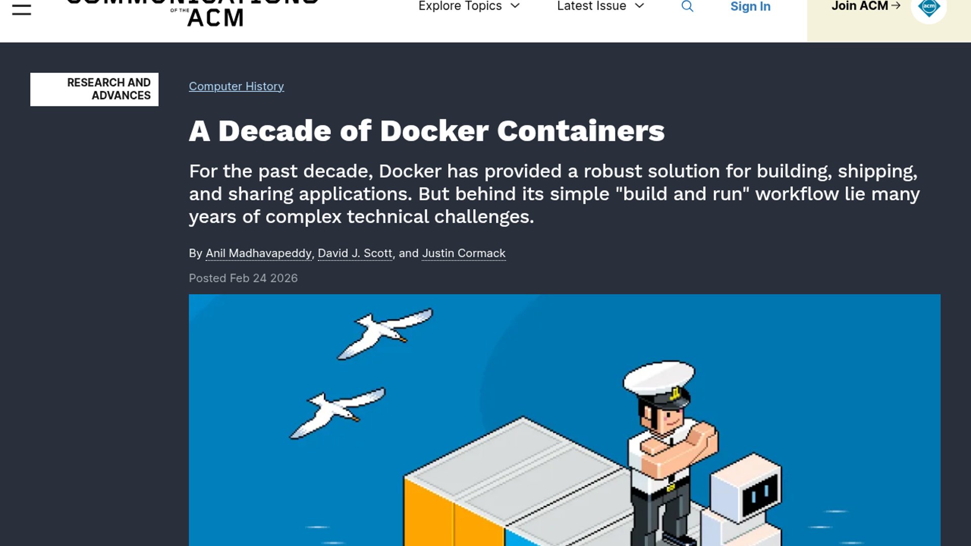 Communications of the ACM published a ten-year retrospective on Docker, tracing how Dockerfiles, reusable images, and portable packaging turned containers into a default developer workflow. The piece matters because the same container model still sits underneath cloud deployment, CI pipelines, and more AI-heavy engineering stacks.