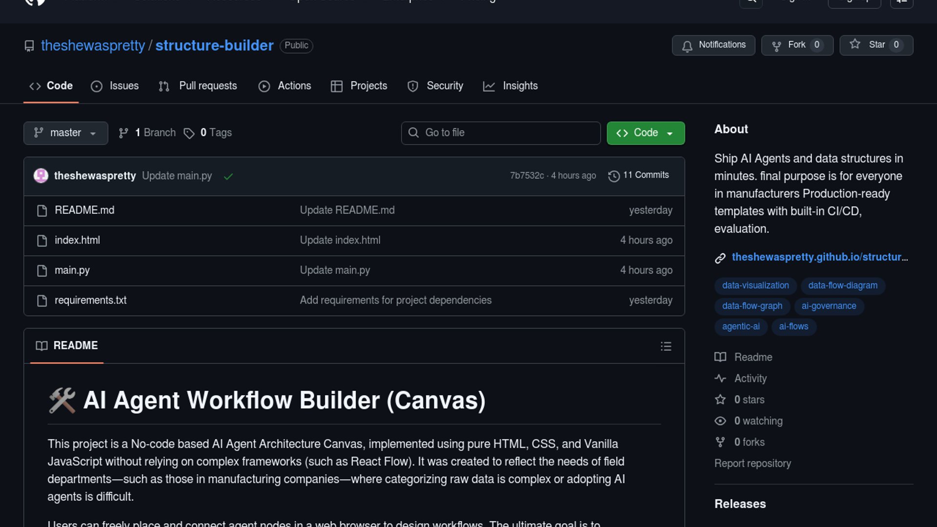 Structure Builder is an open-source, no-code canvas for sketching AI agent workflows in the browser, aimed at beginners and manufacturing teams. The current prototype turns node-and-edge diagrams into Markdown and ASCII architecture docs with AWS Bedrock, so it reads more like a planning tool than a runnable agent runner.