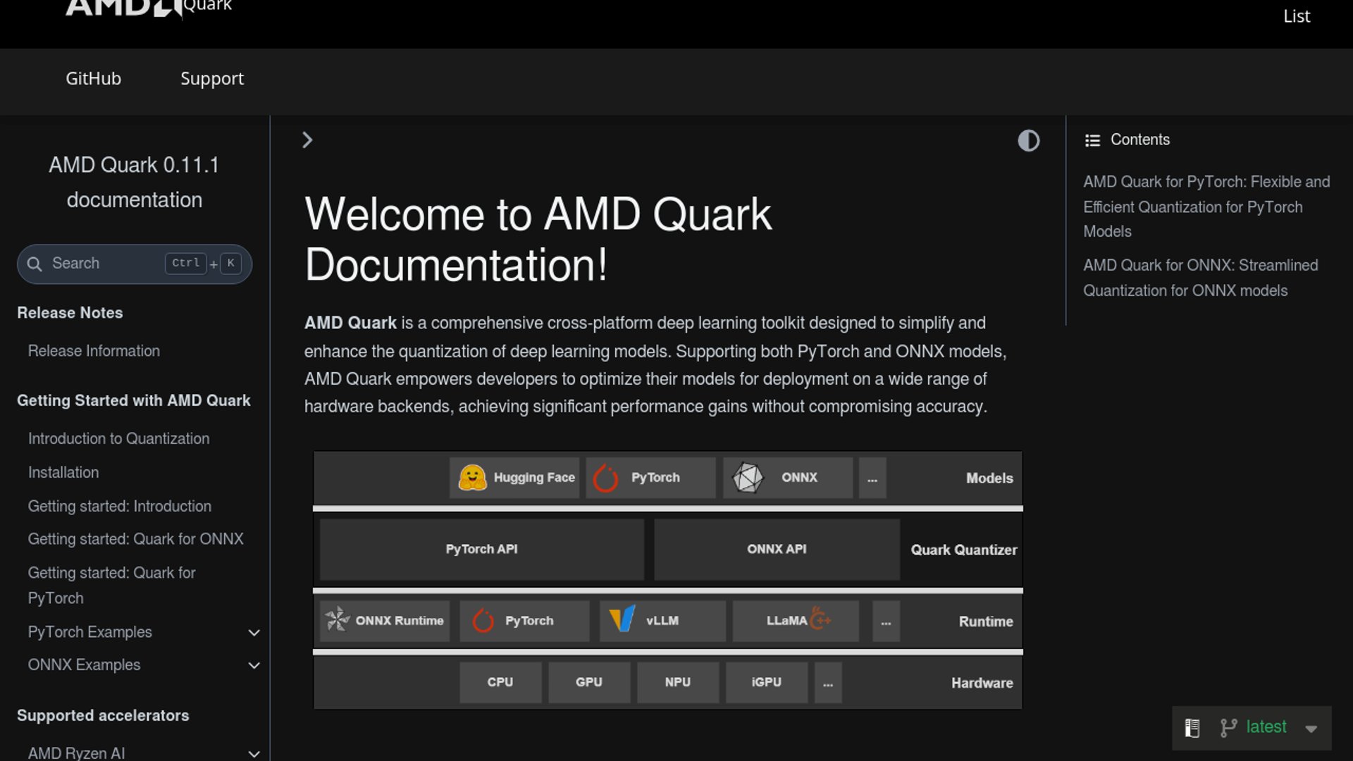 - –AMD's own docs position Quark as a unified quantization library with PTQ, QAT, and multiple flows across PyTorch, ONNX, Hugging Face, and GGUF-style outputs.