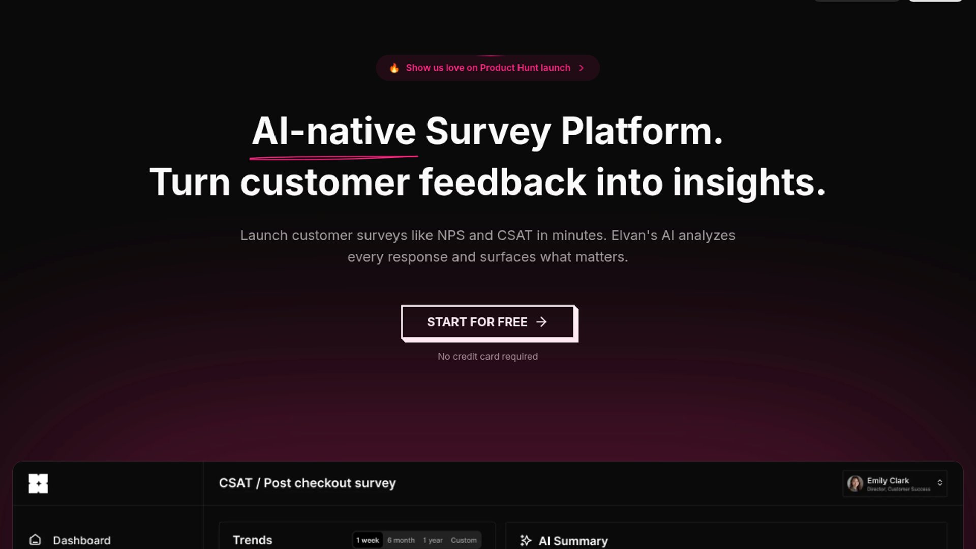 Elvan is an AI-native survey and feedback platform for collecting NPS, CSAT, CES, PMF, and other customer signals across email, embeds, links, and integrations. It analyzes every response with AI to surface sentiment, themes, churn risk, and leadership-ready summaries, then pushes insights to Slack so teams can act quickly without manual tagging or spreadsheet work.