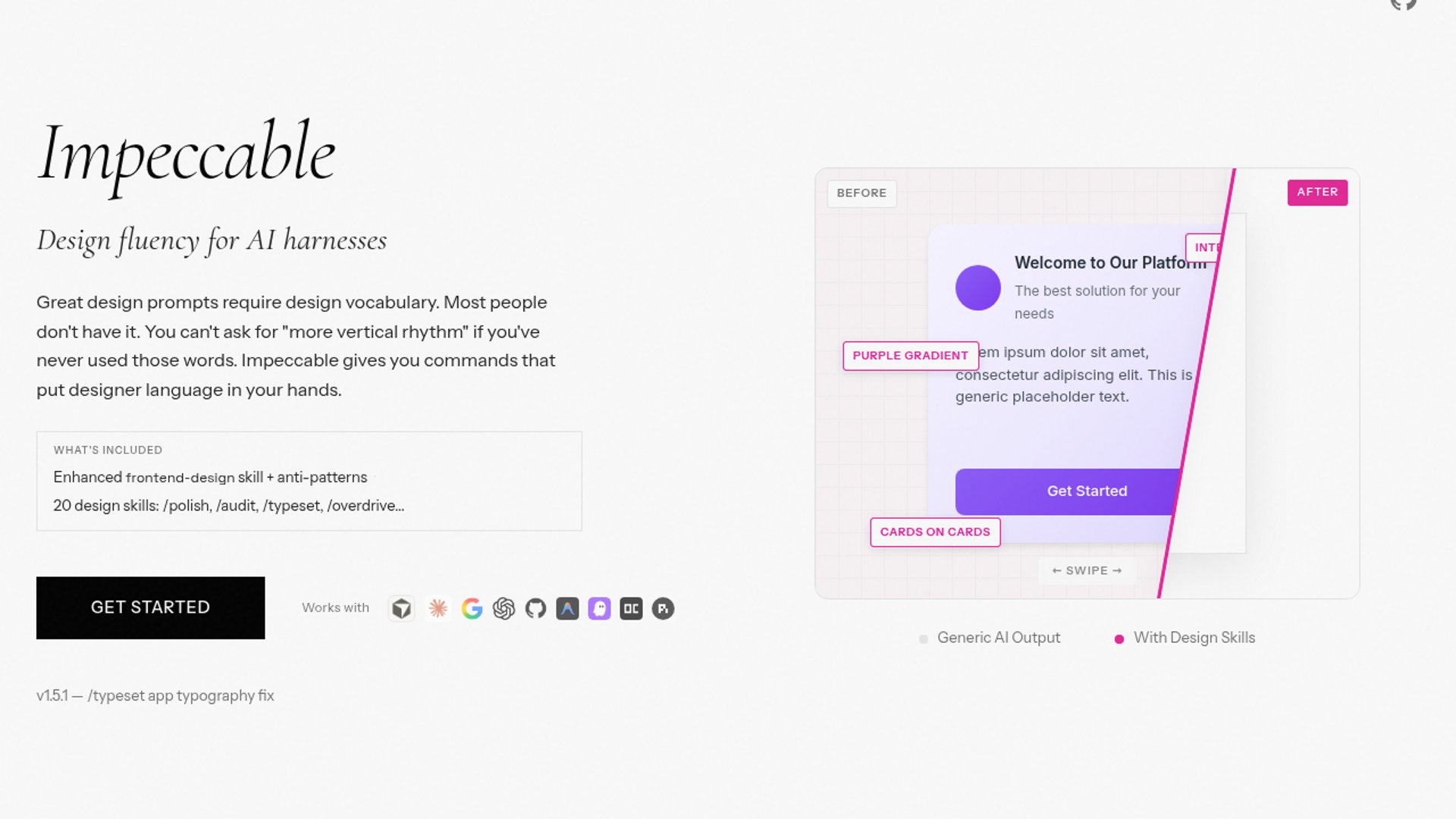 Impeccable is an installable design skill for AI coding assistants that teaches stronger frontend taste through commands, reference files, and anti-patterns. It aims to help agents produce less generic UI by making design judgment reusable across Cursor, Claude Code, Gemini CLI, Codex CLI, and more.