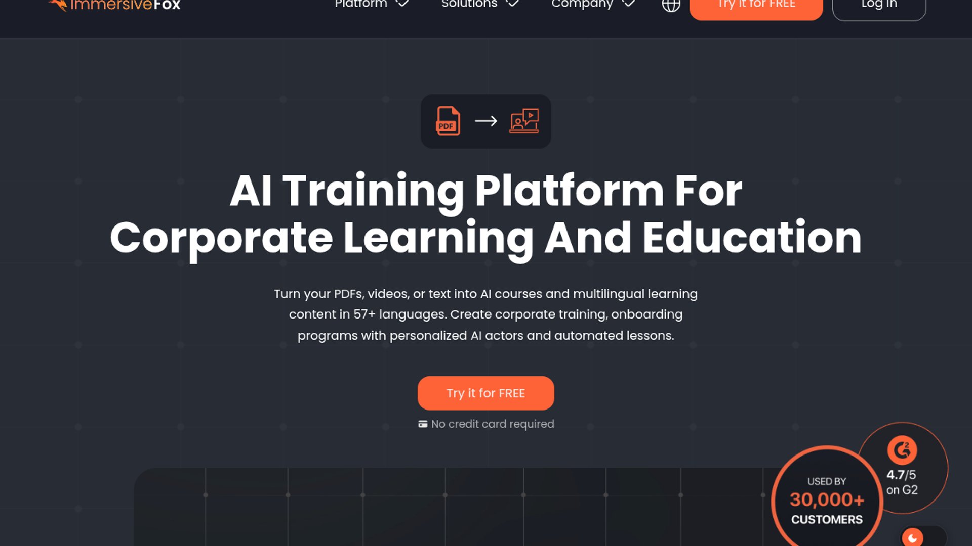 Immersive Fox is an AI training platform for corporate learning and education that turns PDFs, PPTX files, videos, or text into structured courses, lessons, and multilingual learning content. Its current site emphasizes 57+ languages, personalized AI actors, quizzes, and enterprise and academic workflows, with the core promise of faster onboarding and lower training-production overhead.