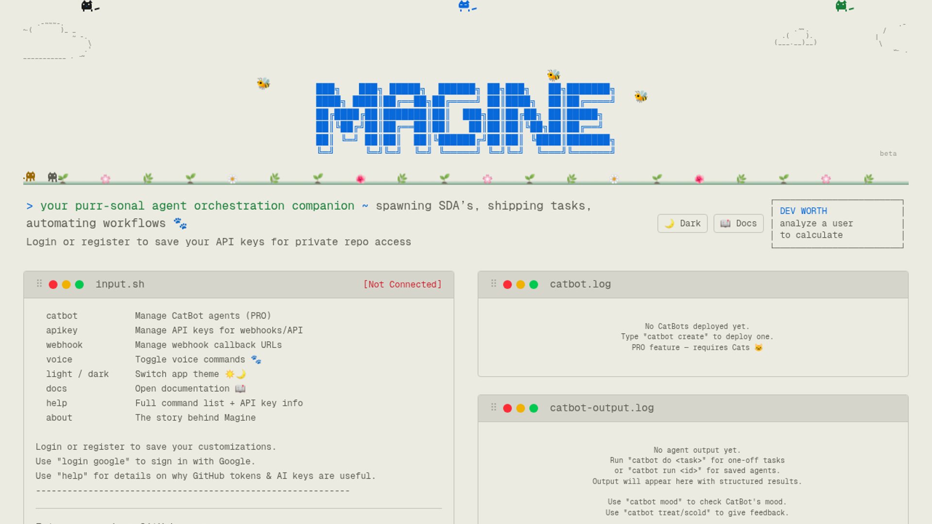 Magine offers a retro-style web terminal for orchestrating vision-enabled AI "CatBots" that autonomously execute complex browser workflows. The platform features specialized digital agents pre-configured for tasks like LinkedIn networking, job applications, and GitHub profile analysis.