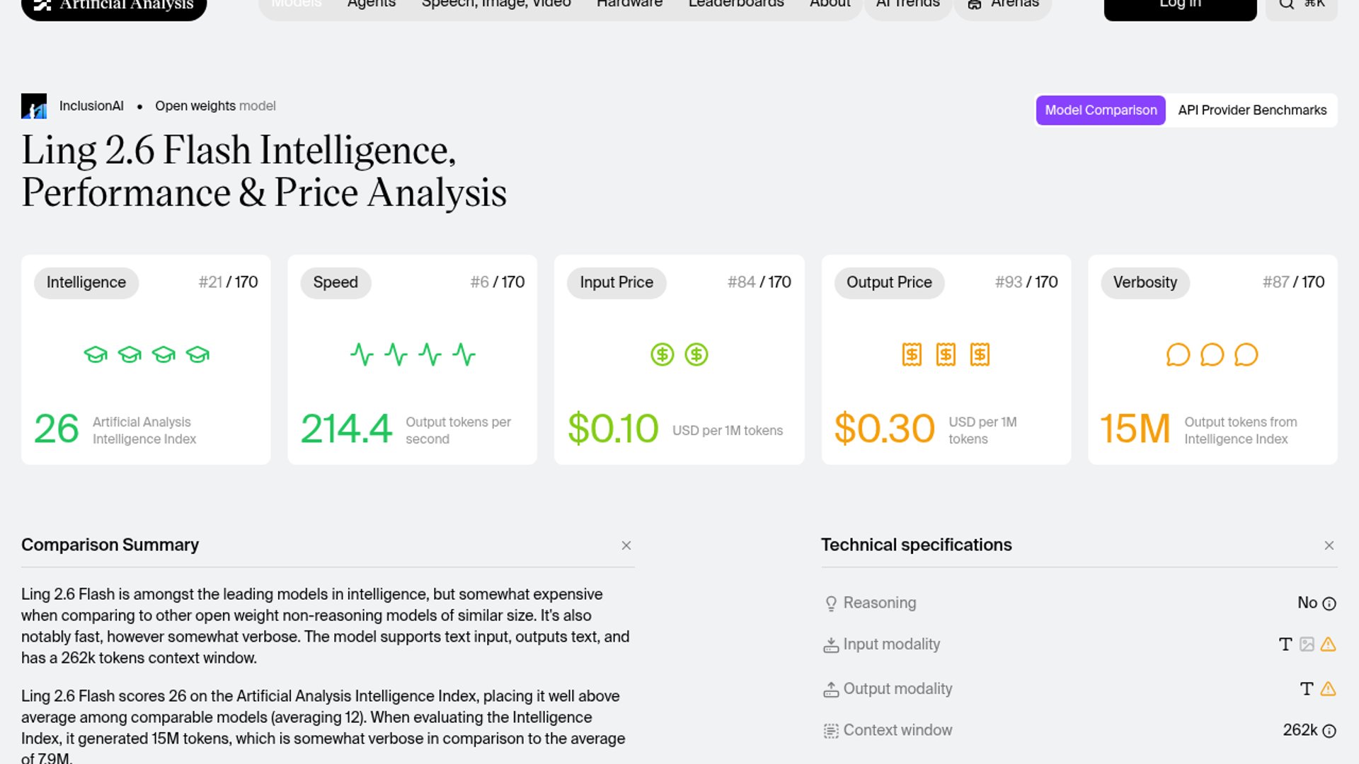 - –Artificial Analysis lists Ling 2.6 Flash as an InclusionAI open-weights, text-only, non-reasoning model with a 260K context window
