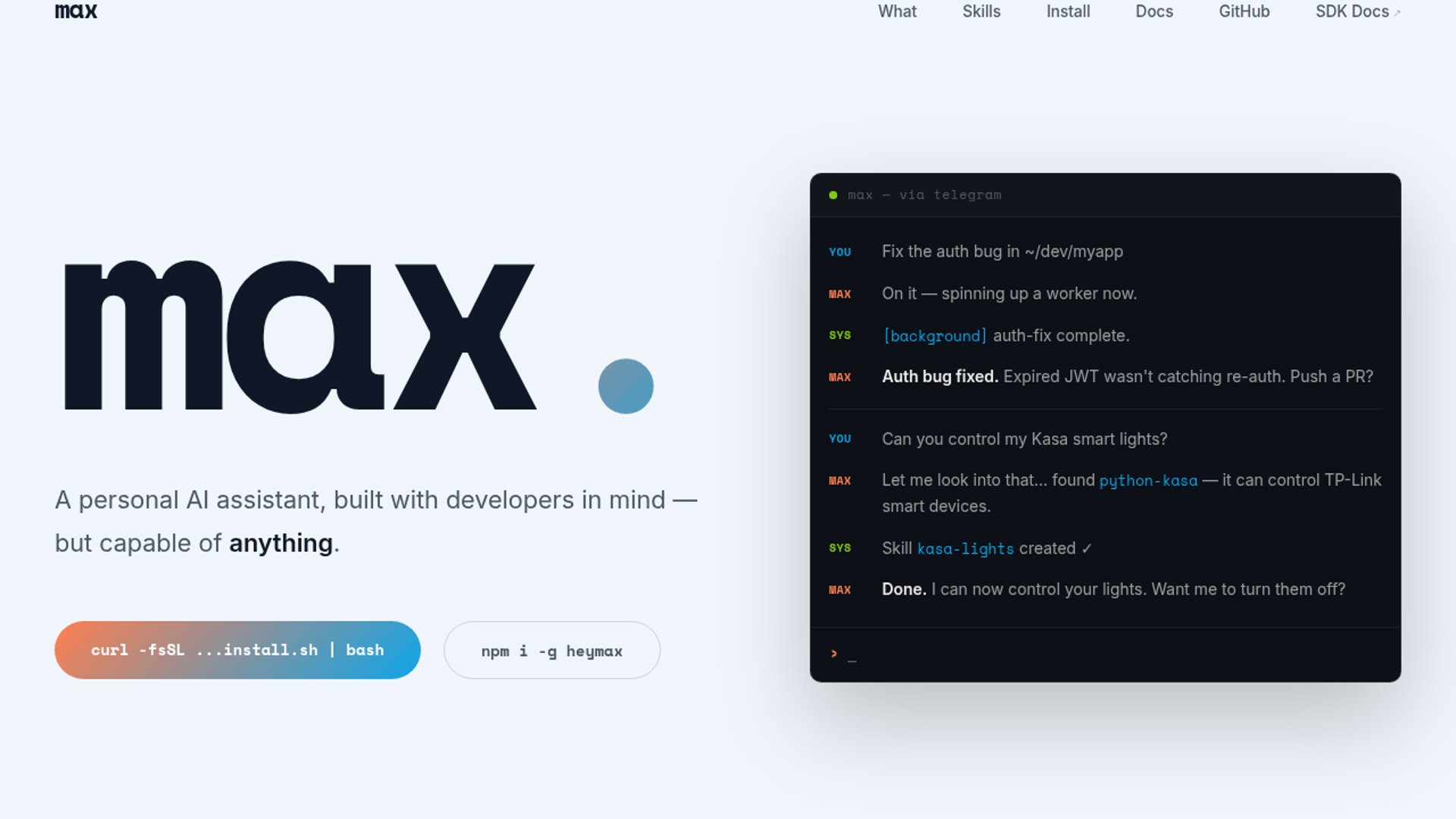 Max is a personal AI developer assistant built on the GitHub Copilot SDK that runs as a persistent local daemon, executes background coding tasks through Copilot CLI workers, and reports back via Telegram. The demo frames it as a practical “always-on” workflow layer for everyday developer and productivity tasks.