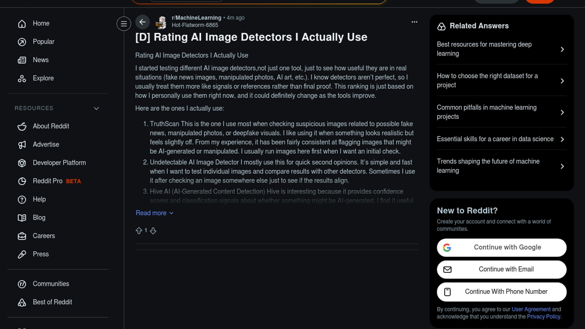 A r/MachineLearning contributor shares a hands-on ranking of five AI image detection tools — TruthScan, Undetectable AI, Hive AI, Reality Defender, and Google Gemini — for identifying fake news images and deepfakes. The core finding: no single detector is trustworthy on its own; reliable verification still requires stacking multiple tools with manual inspection.