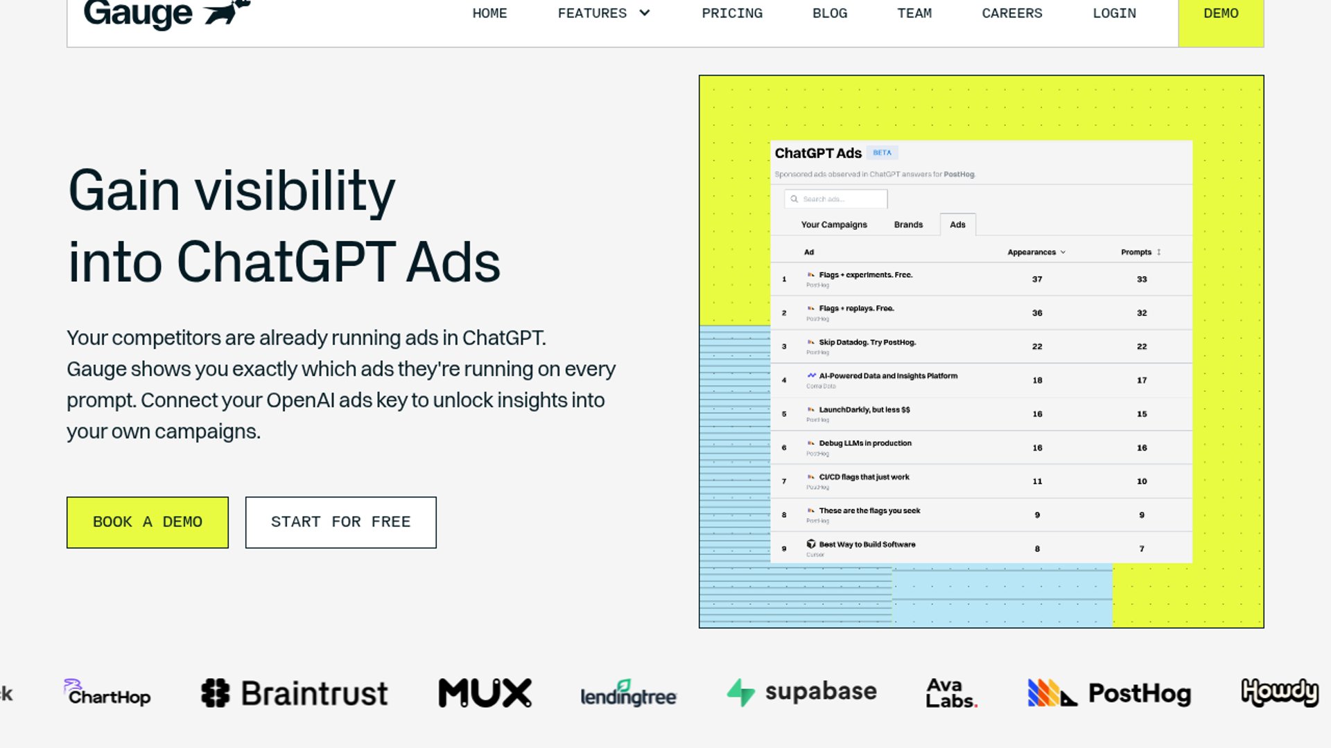 ChatGPT Ads by Gauge gives marketers visibility into sponsored placements inside ChatGPT and lets them inspect which ad copy competitors run against specific prompts. It also connects an OpenAI Ads API key to monitor campaign performance across spend, impressions, clicks, CTR, and CPC.