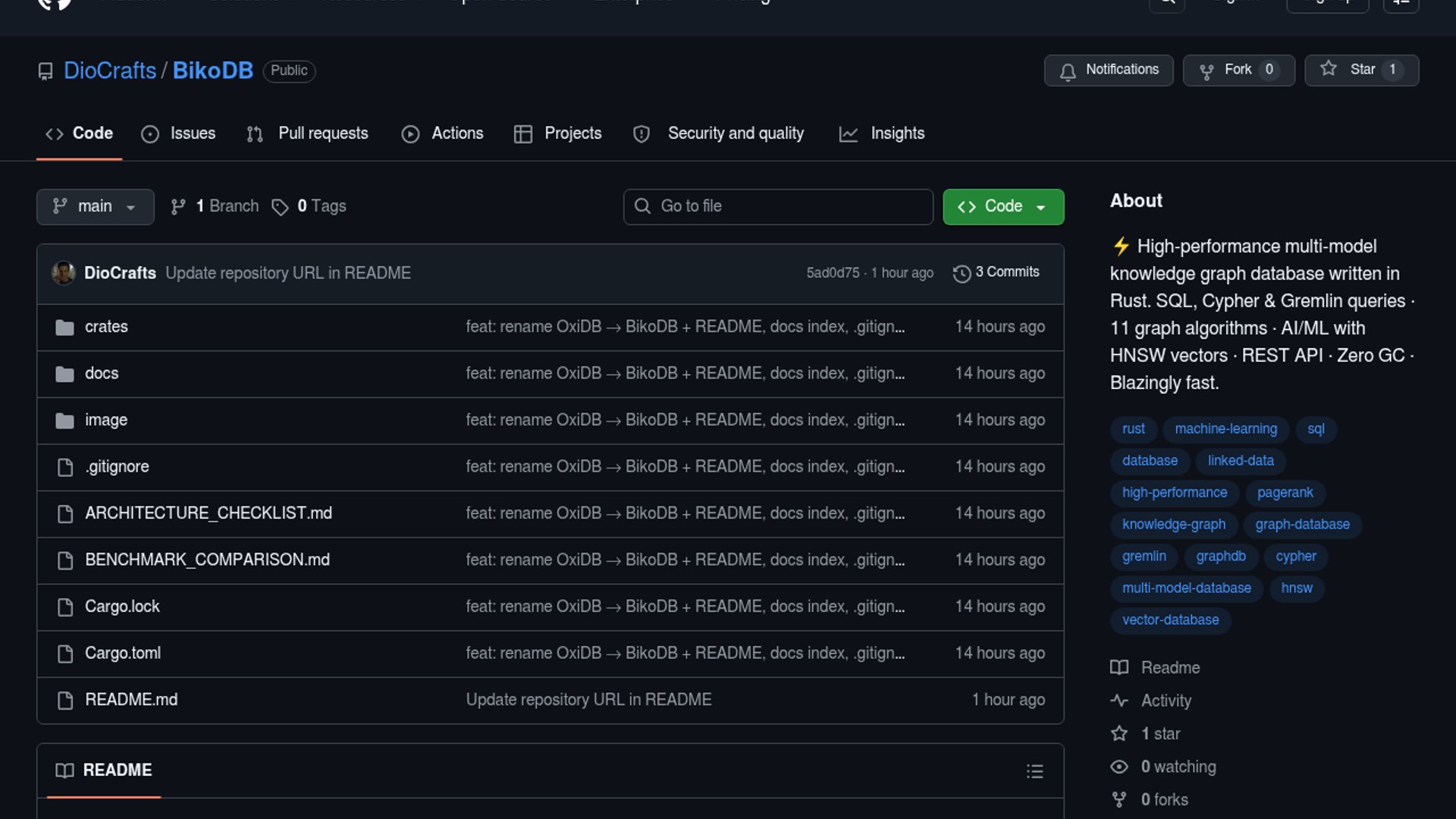 BikoDB is an open-source Rust graph engine that tries to unify graph, document, and vector workloads with SQL, Cypher, and Gremlin support. The repo positions it as an embeddable, zero-GC alternative to JVM-heavy graph stacks, with native graph algorithms and HNSW/GNN features.