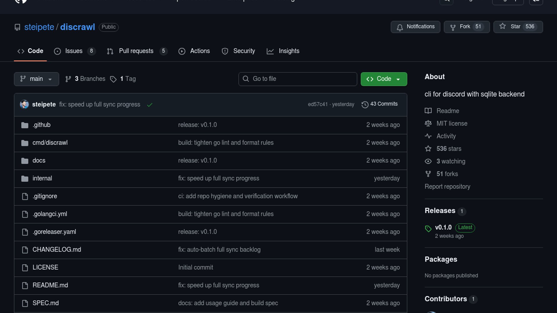 discrawl is a Go-based command-line Discord client that mirrors guild data into local SQLite, including channels, threads, members, message history, mentions, and small attachments. It is built around bot-token access, fast FTS-backed local search, and read-only SQL analysis, making it a practical archive-and-query layer for developers who want Discord history to be inspectable outside the app.