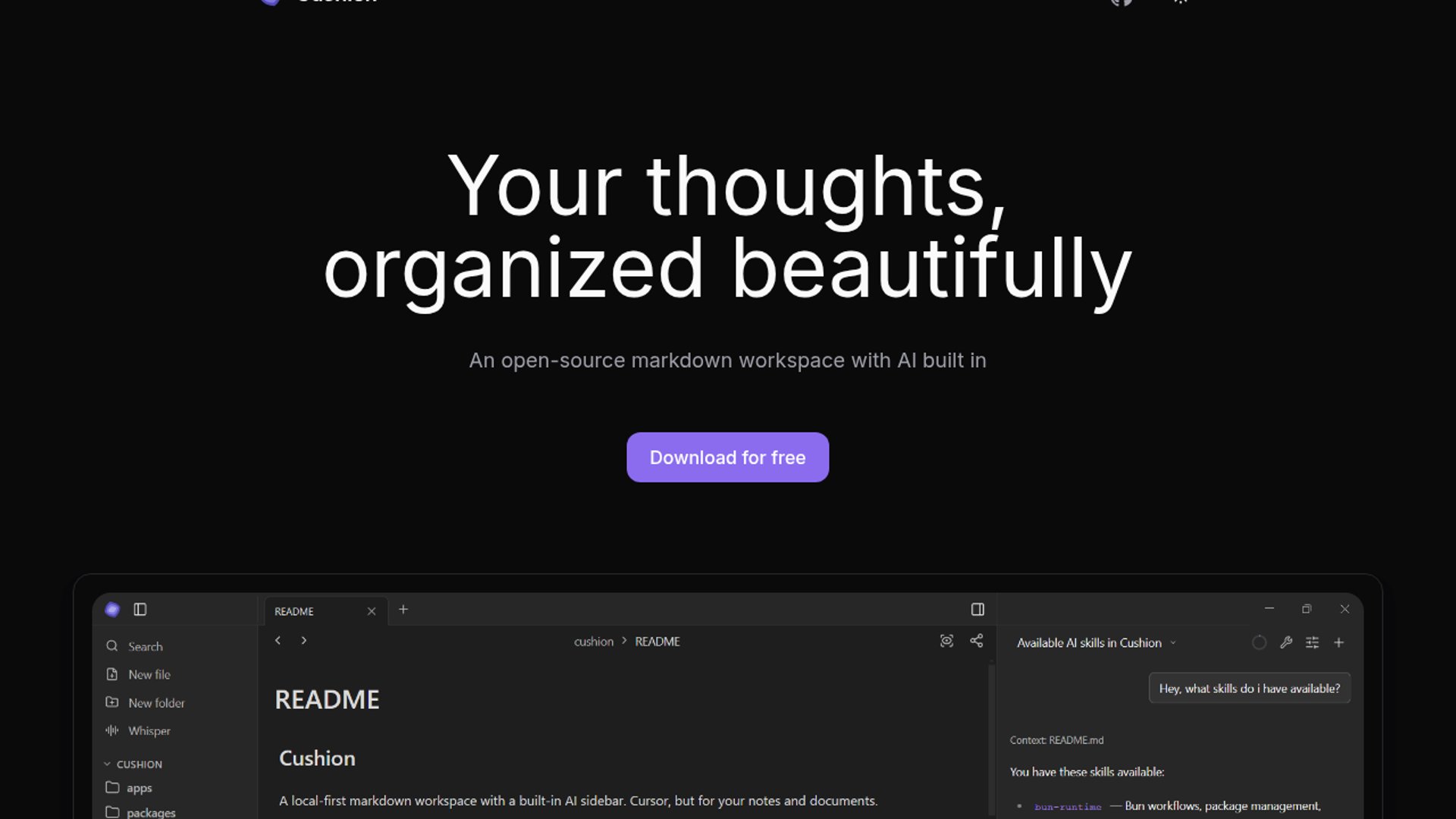 Cushion is an open-source, local-first markdown workspace with an AI sidebar, aiming to merge note-taking and assistant workflows. Its GitHub repo says the app is usable day to day in beta, with dictation, PDF viewing, Excalidraw, and math support already in place.