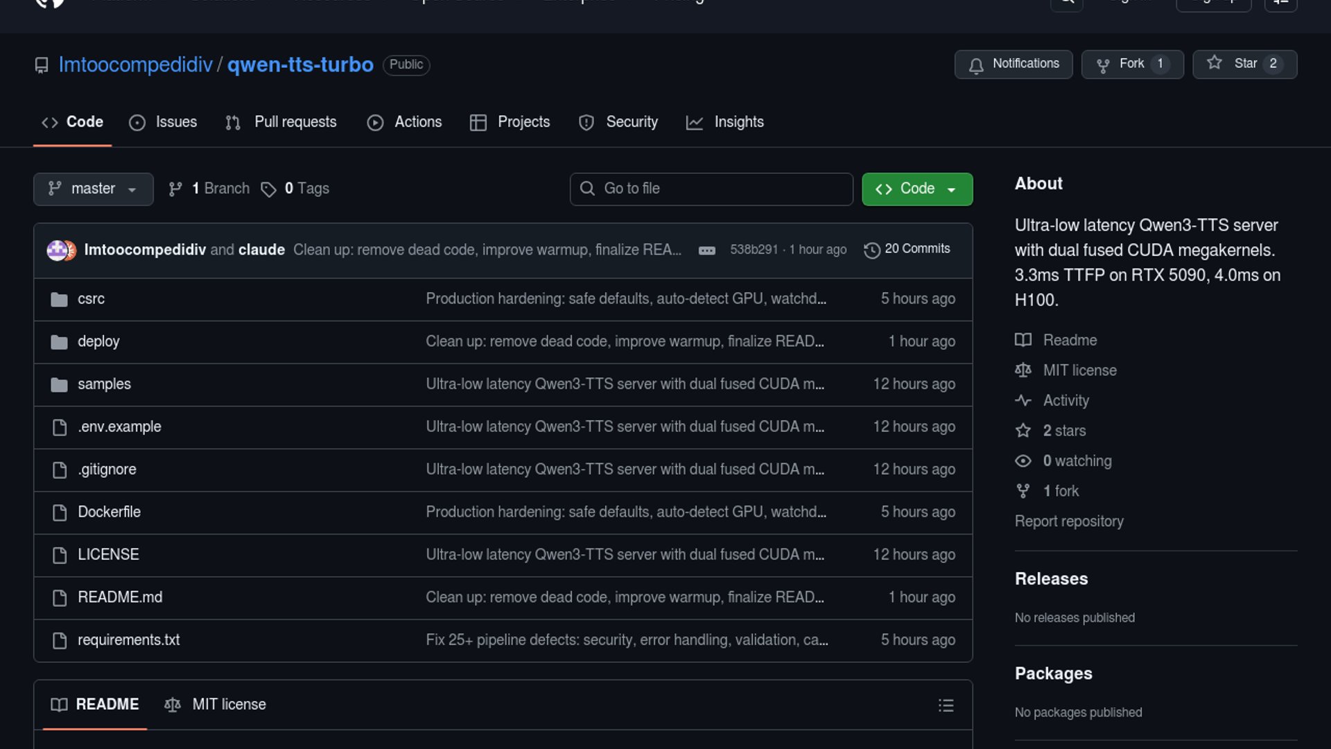 qwen-tts-turbo is an open-source low-latency serving layer for Qwen3-TTS, built around fused CUDA megakernels, prefix KV caching, and WebSocket streaming. The repo claims 3.3ms time-to-first-frame on RTX 5090 and 4ms on H100, with synchronized GPU timing rather than queue-time shortcuts.